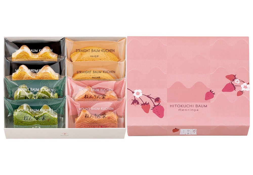 ねんりん家で春だけしか味わえない、苺の香り華やぐバームクーヘン。バターのコク広がる『マウントバーム』に、福岡県産「あまおう」の甘酸っぱい苺の味わいを加えて、じっくりと焼き上げました。ホワイトショコラを生地に練り込むことで引き立つ、苺のふくよかな美味しさをお楽しみください。暖かな春の訪れを思わせる、春色の山並み。大切なあの人に贈る、春のお祝いギフトとしてもどうぞ。