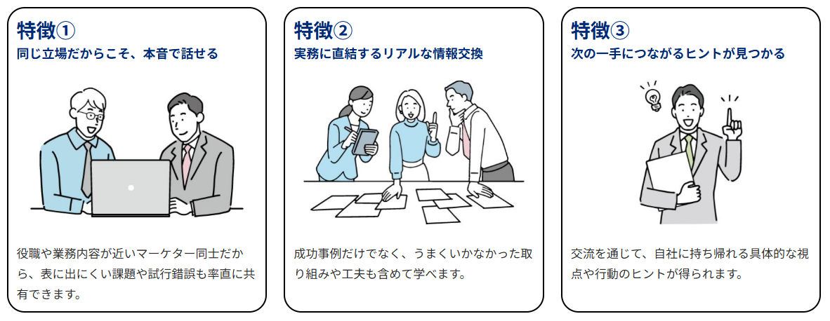 本交流会では、同じ立場のマーケター同士がリアルな課題や工夫を共有し、“次の一手”につながるヒントを得ることができます。