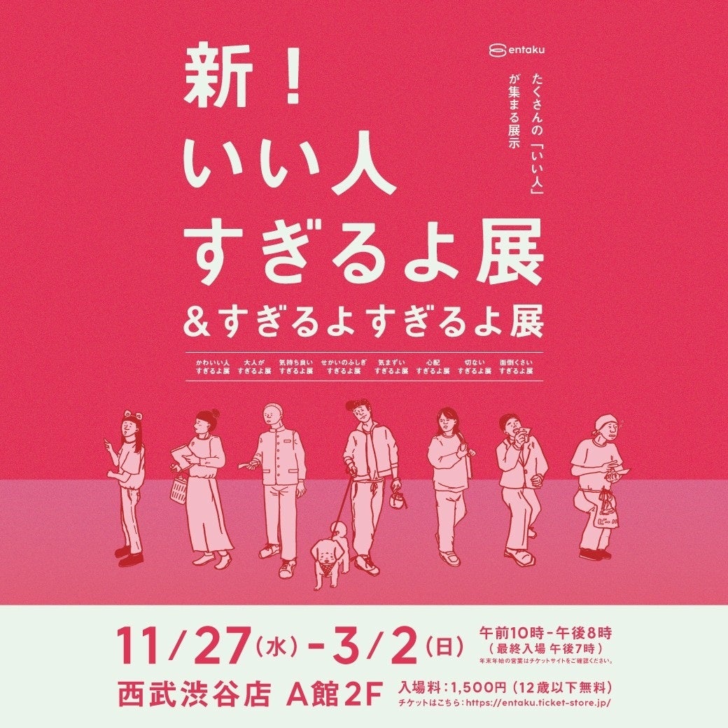 西武渋谷店では2025年3月2日(日)までの期間、A館2階=イベントスペースで「新!いい人すぎるよ展&すぎるよすぎるよ展(主催:entaku)」を開催いたしております。累計来場者35万人超え!日常に潜む「いい人」にスポットライトを当てた日本一?ハッピーな企画展。今回はシリーズ最新作の「新!いい人すぎるよ展」のほか、「かわいい人すぎるよ展」「大人がすぎるよ展」など計9展示を同時開催。1月18日(土)からは同テーマで後半展示がスタートいたします。日常に潜むクスっと笑える人や瞬間に共感しながら、この新感覚な展示をぜひお楽しみください。