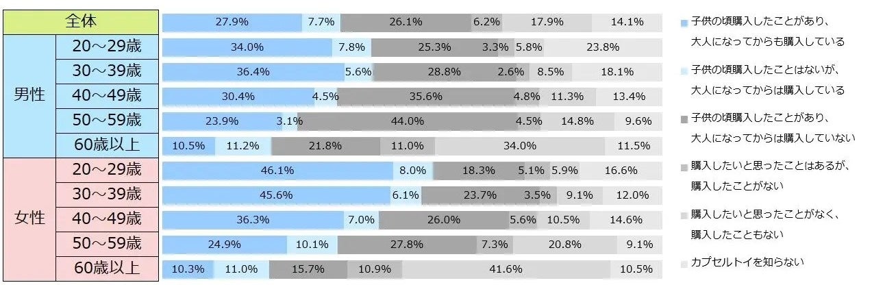 当社が2024年2月~3月に実施したインターネットアンケート調査では、20代・30代女性の2人に1人が、大人になってからカプセルトイを購入したことがある、ということが明らかになりました。男性も含めた全年齢平均でも、購入経験者は3割を超えており、カプセルトイの大人人気の高さが裏付けられました。