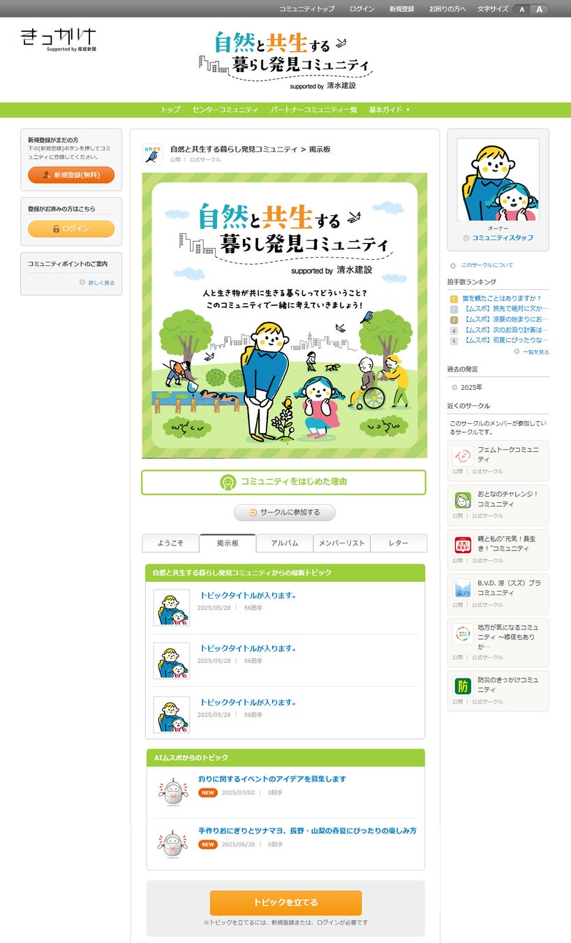 産経新聞社とクオンが共同で運営する、インターネット上でユーザー同士が対話を楽しむオンラインコミュニティ「きっかけ」内に、自然と共生する生活や社会のあり方をテーマに語り合う「自然と共生する暮らし発見コミュニティ supported by 清水建設」が、7月11日(金)にオープンしました。【URL】 https://www.beach.jp/community/SHIMIZU-KENSETSU/