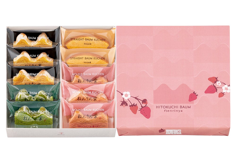 2つの代表作『マウントバーム しっかり芽』『ストレートバーム やわらか芽』、春限定『マウントバーム 苺バター』、芳醇に⾹る『マウントバーム お抹茶』が楽しめる詰合せ。