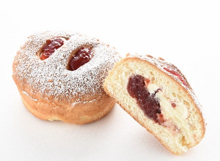 苺ジャムを包んで焼きあげ、さらに苺ジャムとホイップクリームをあわせたカスタードクリームを絞りました。