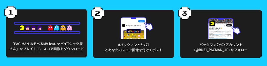①特設サイトで“PAC-MAN あそべるMV feat. ヤバイTシャツ屋さん『PAC-MANISM』 “をプレイし、スコア画像を保存