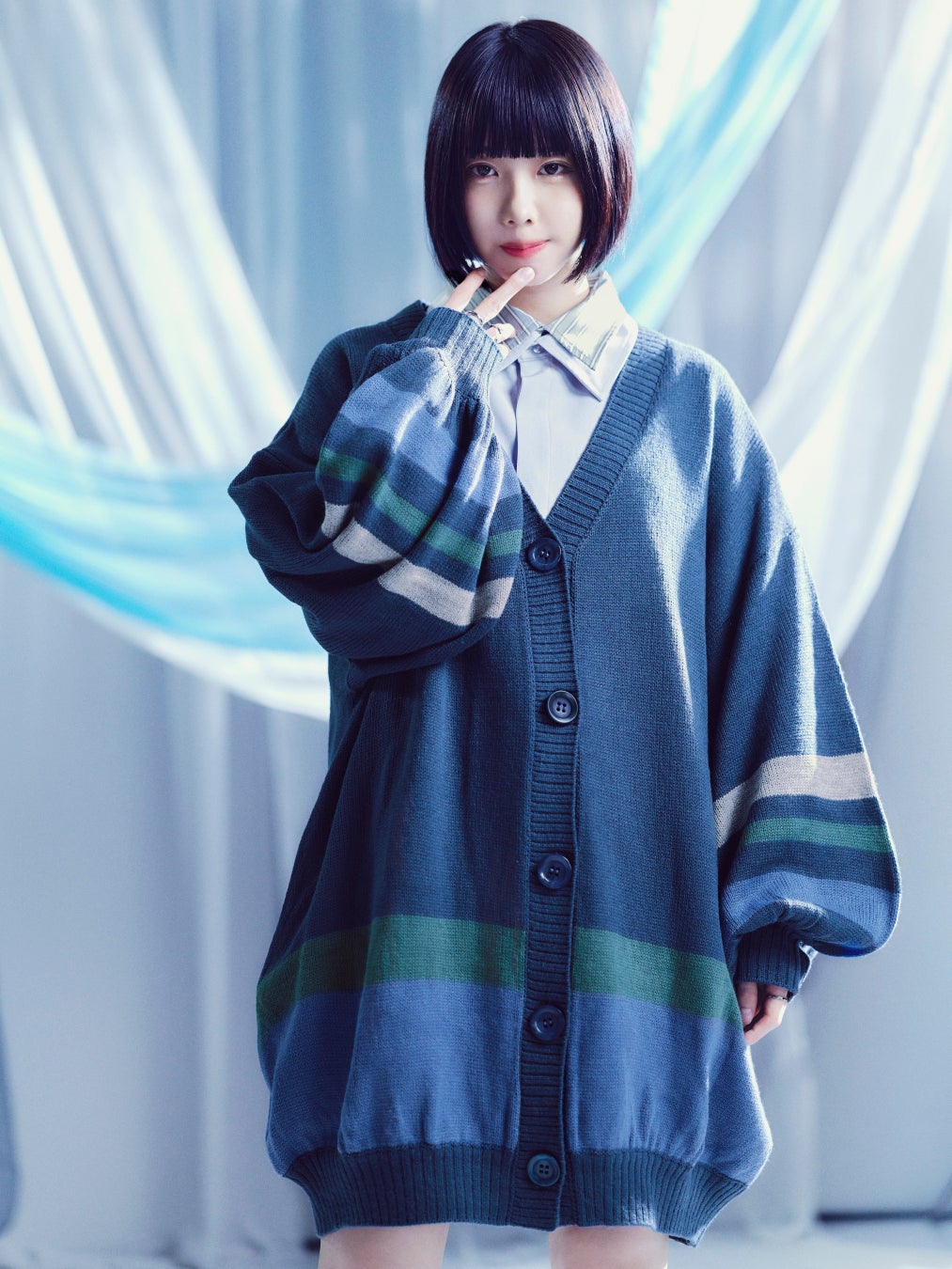 あのビッグなカーディガンは結構デカいんで、ワンピースみたいにして着れるし、カラダがデカい人でも大丈夫なようにしました。