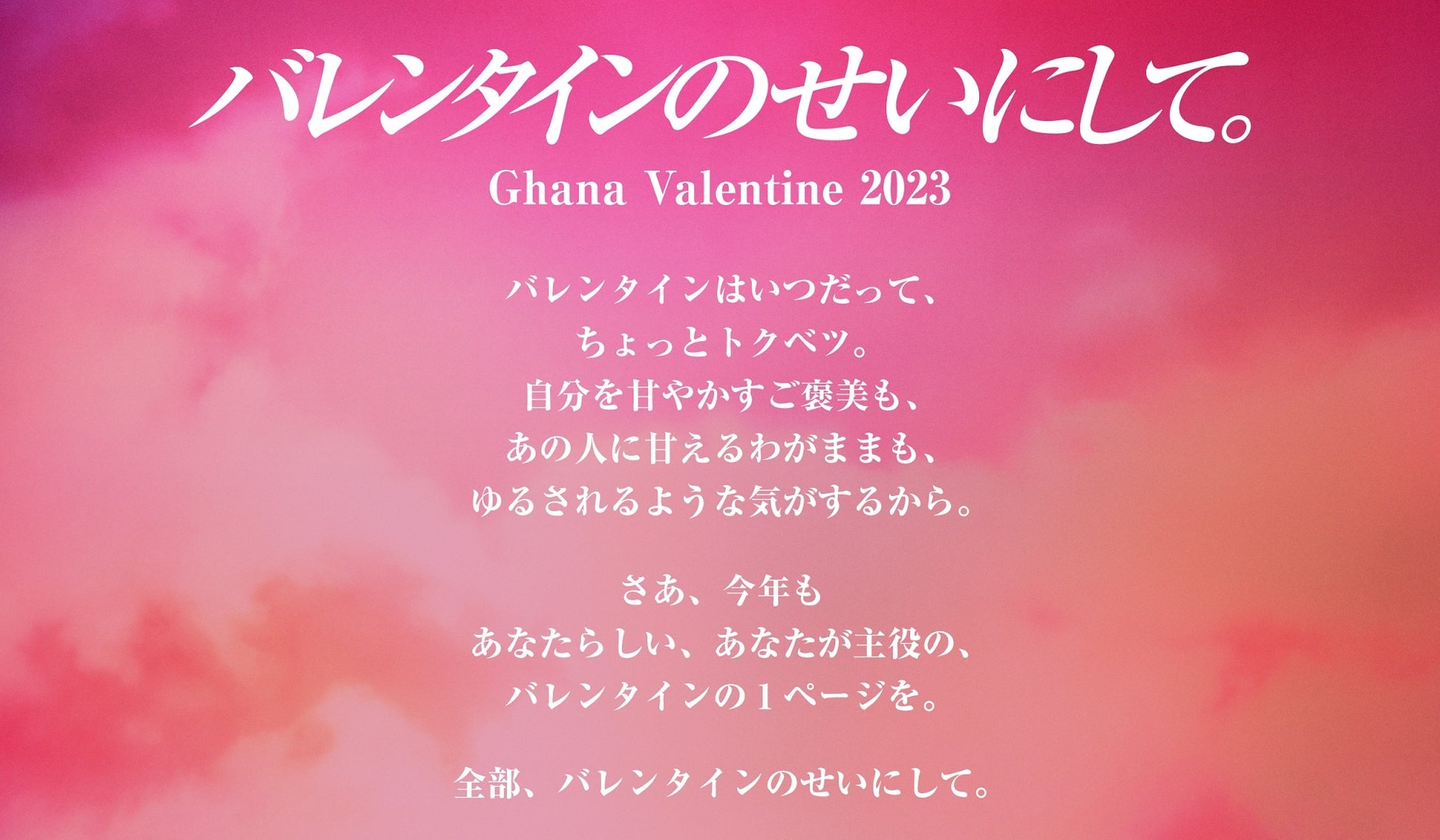 「バレンタインのせいにして。」今年のバレンタインは、昨年に引き続き日本中の皆さんが思い思いにバレンタインを楽しむ世の中になるように、という想いを込めてガーナからのメッセージを発信します。