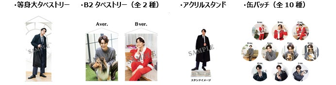 賞品には、目玉となる等身大タペストリーをはじめ、B2タペストリー(全2種)、アクリルスタンド、缶バッジ(全10種)をご用意。この時期にぴったりなサンタクロース姿や、ワンちゃんとのくつろぎショット、ロングコートにスーツのクールなカットまで、全て撮り下ろしのビジュアルでデザインされています。