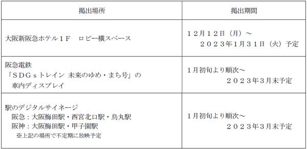 集まった作品の総数は951点で、同作品を12月12日(月)より大阪新阪急ホテル1Fのロビー横スペースで展示します。また、作品を使用して制作した映像を、阪急電鉄の「SDGsトレイン 未来のゆめ・まち号(※2)」の車内ディスプレイや、阪急・阪神の主要駅に設置しているデジタルサイネージで放映します。