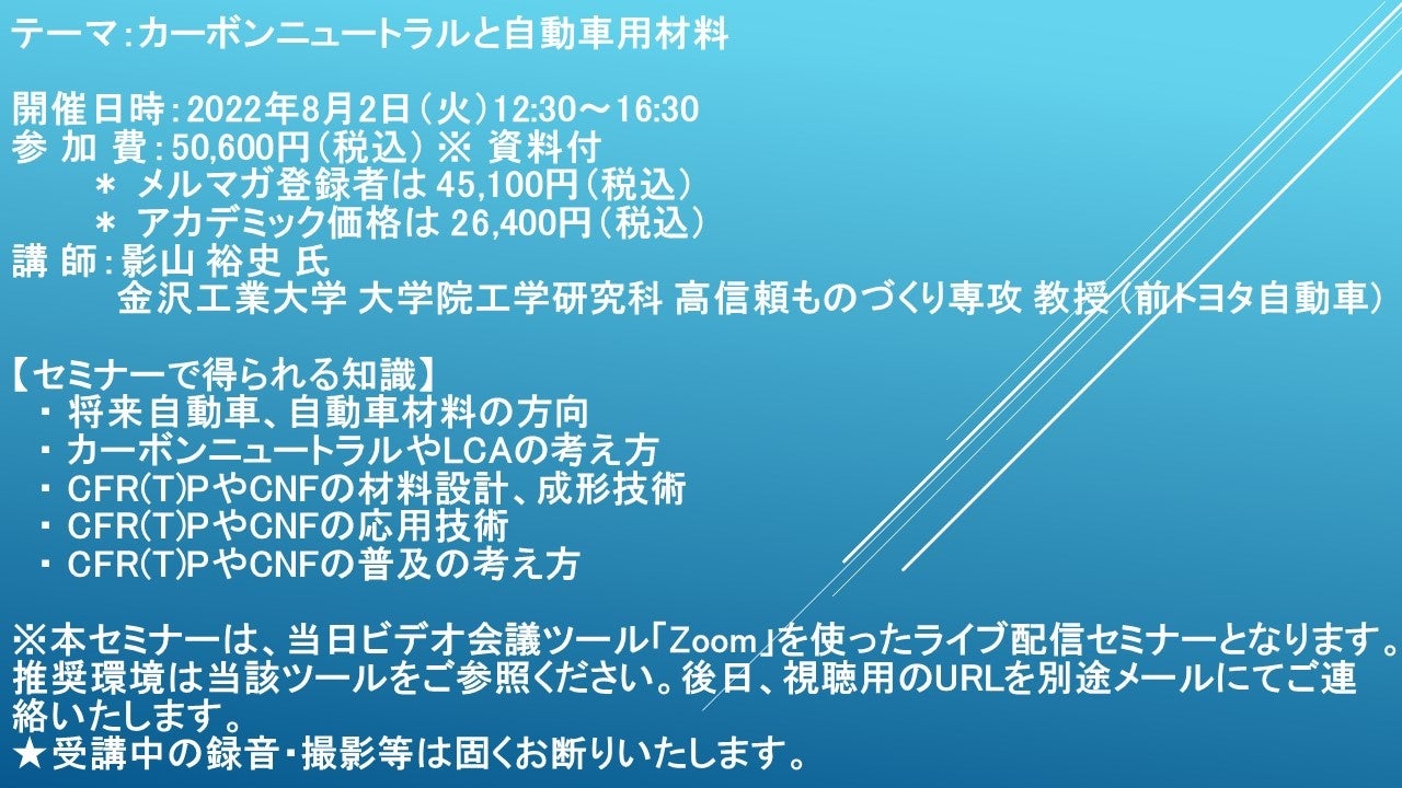 先端技術情報や市場情報を提供している(株)シーエムシー・リサーチ(千代田区神田錦町: https://cmcre.com/ )では、 各種材料・化学品などの市場動向・技術動向のセミナーや書籍発行を行っておりますが、 このたび「カーボンニュートラルと自動車用材料」と題するセミナーを、 講師に影山 裕史 氏 金沢工業大学 大学院工学研究科 高信頼ものづくり専攻 教授 (前トヨタ自動車))をお迎えし、2022年8月2日(火)12:30より、 ZOOMを利用したライブ配信で開催いたします。 受講料は、 一般:50,600円(税込)、 弊社メルマガ会員:45,100円(税込)、 アカデミック価格は26,400円(税込)となっております(資料付)。