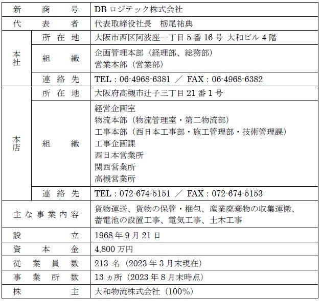 今回の商号変更に伴い、グループ企業の連携強化の一環として、現在ユアサロジテック本社に設置する一部の組織を当社が所在する大阪市西区の大和ビルに移転し、2023年9月1日からDBロジテック本社として業務を開始します。
