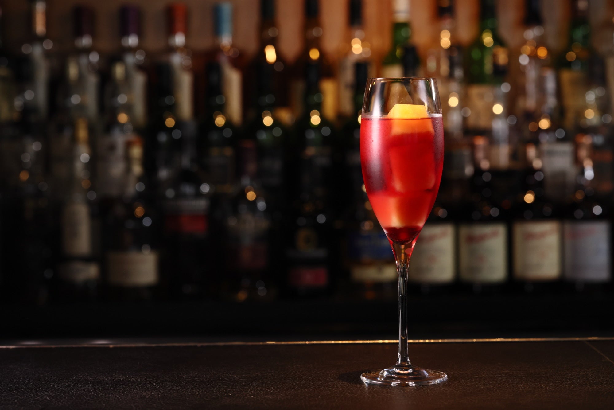 りんごピューレを凍らせたキューブをカクテルに取り入れました。