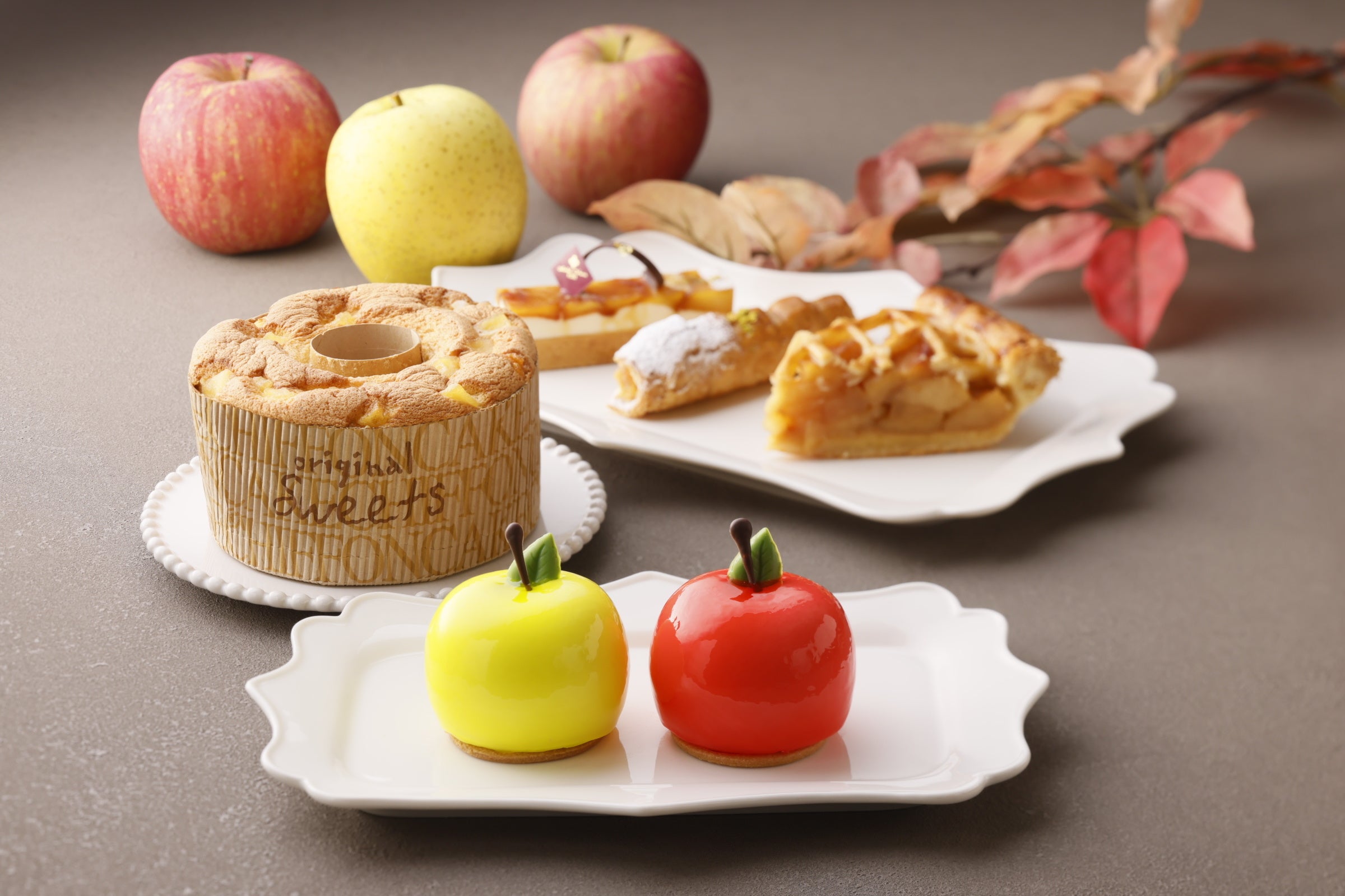 (季節のショートケーキ、季節のフルーツ、ピスタチオ入りスコーン、ショーソン・オ・ポム、りんごのタルト、りんごのショコラパウンドケーキ、マロンムース、りんごムース)