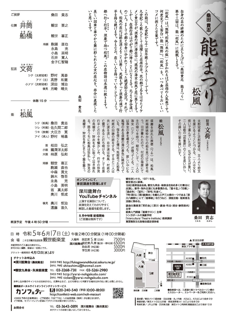 観世流能楽師 桑田貴志率いる 能まつり『松風』能楽屈指の人気曲 銀座 観世能楽堂にて上演決定 カンフェティでチケット発売