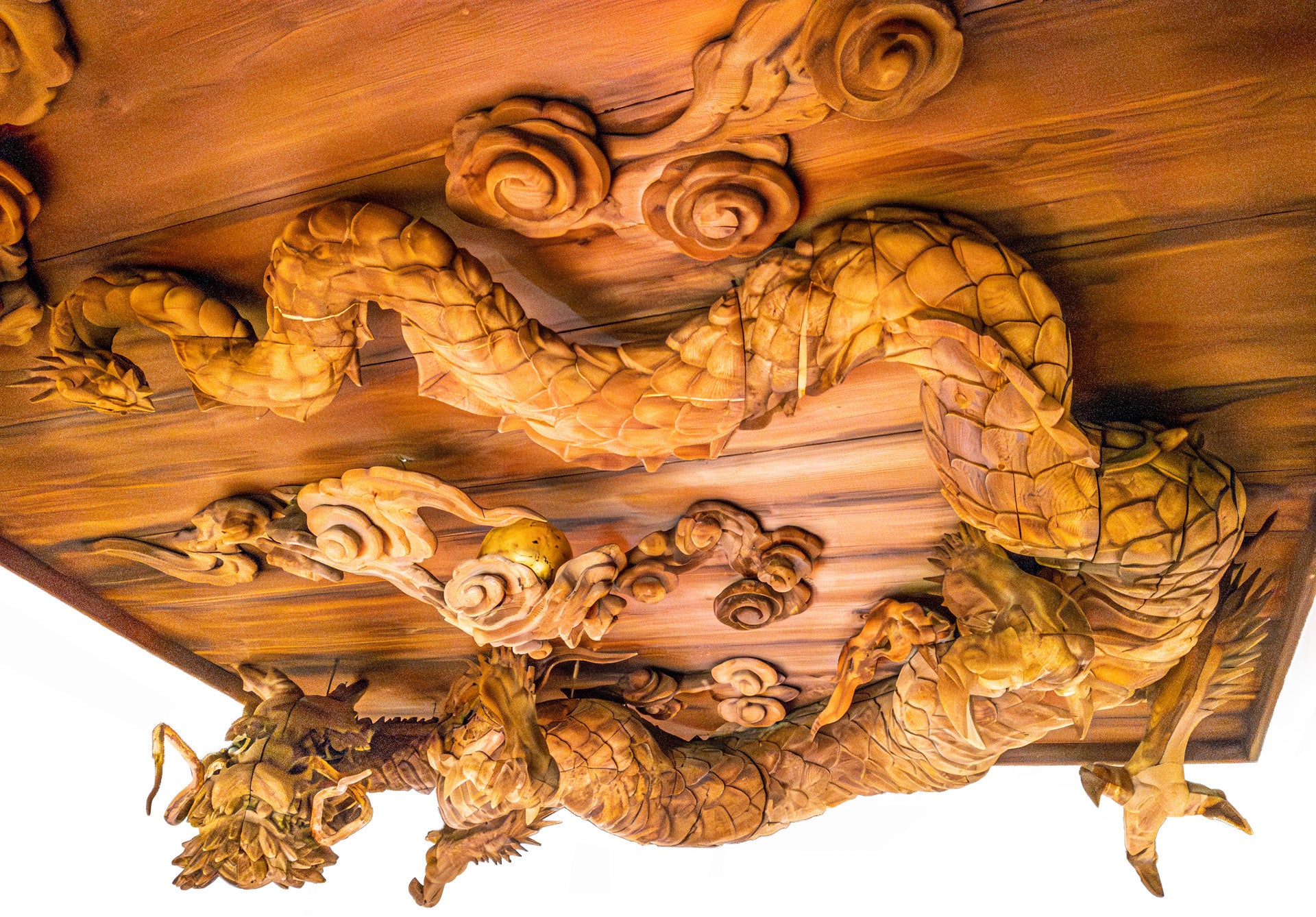 京彫刻の名家として知られる九山家の彫刻匠・九山新太郎が江戸後期に作成した日本最大級、全長約8メートルの瀧尾神社拝殿の木彫り彫刻「天井昇龍」。