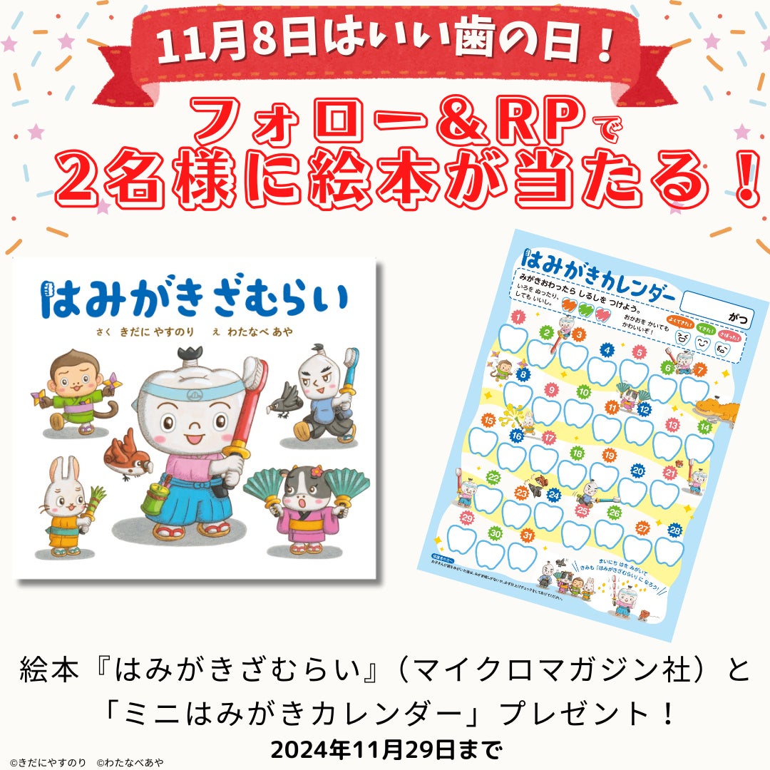 11月8日は「いい歯の日」‼歯磨きが楽しくなる絵本『はみがきざむらい』と「ミニはみがきカレンダー」が抽選で2名様に当たるプレゼントキャンペーン開催!