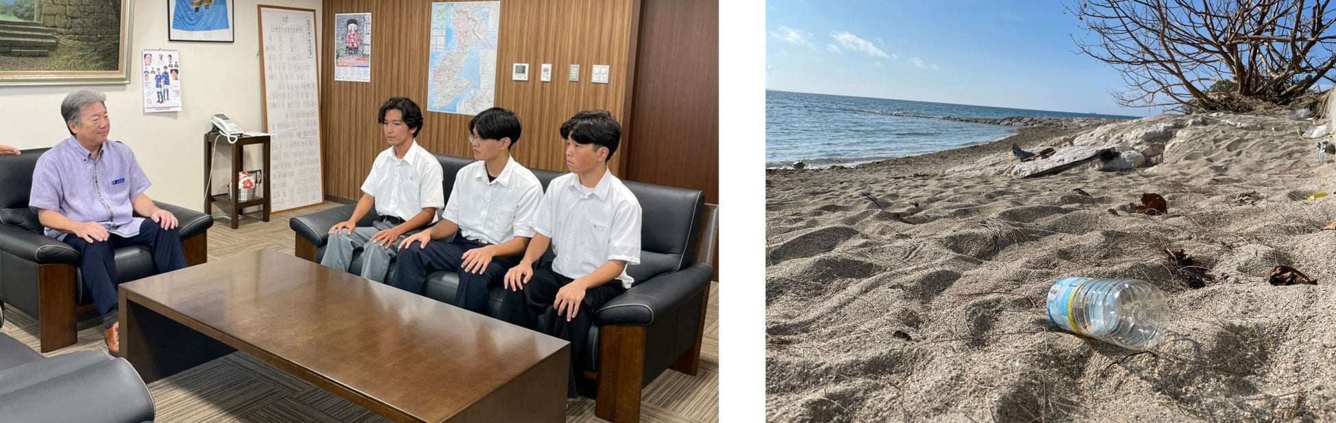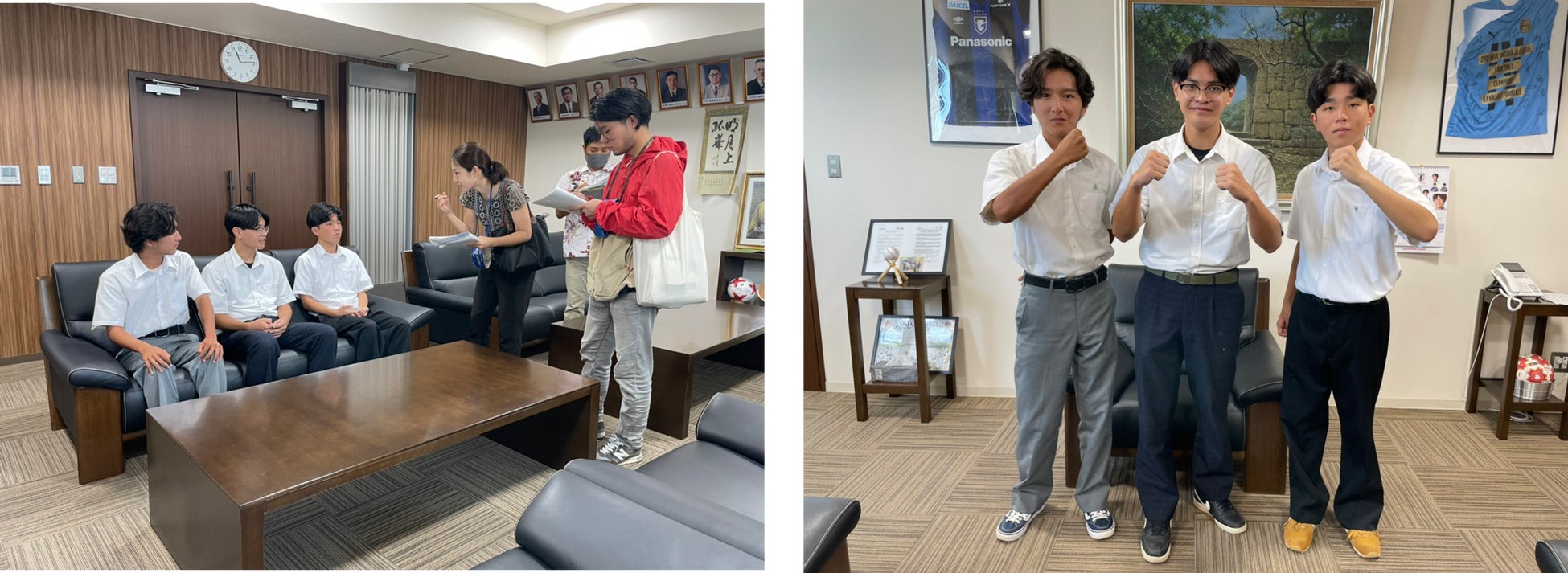 2023年8月19日に行われた『スポGOMI甲子園2023・沖縄県大会』で優勝した嘉手納高等学校、読谷高等学校、美里工業高等学校の合同チーム3人組の「Sunny」が、大会での成果を報告するためスポGOMI甲子園の会場となった中城村の浜田村長を表敬訪問しました。