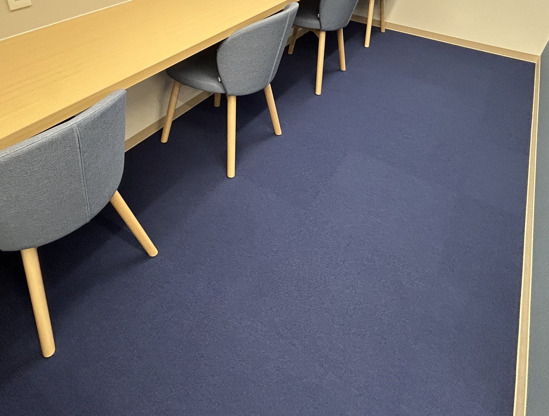 ・当営業所の床材には、川島織物セルコン製のタイルカーペットを採用しています。同社は環境大臣より「エコ・ファースト企業」に認定されており、廃床材を再資源化するリサイクル循環システム「e-RECYCLED」を展開しています。この仕組みにより、使用済みタイルカーペットを無駄なく活用し、新たな再生素材のタイルカーペットとして生まれ変わらせることで、産業廃棄物の削減に貢献しています。今回の導入では、約135kgのリサイクル原料を活用することで、CO₂排出量を約73%削減する効果が見込まれており、環境負荷の低減に寄与しています。