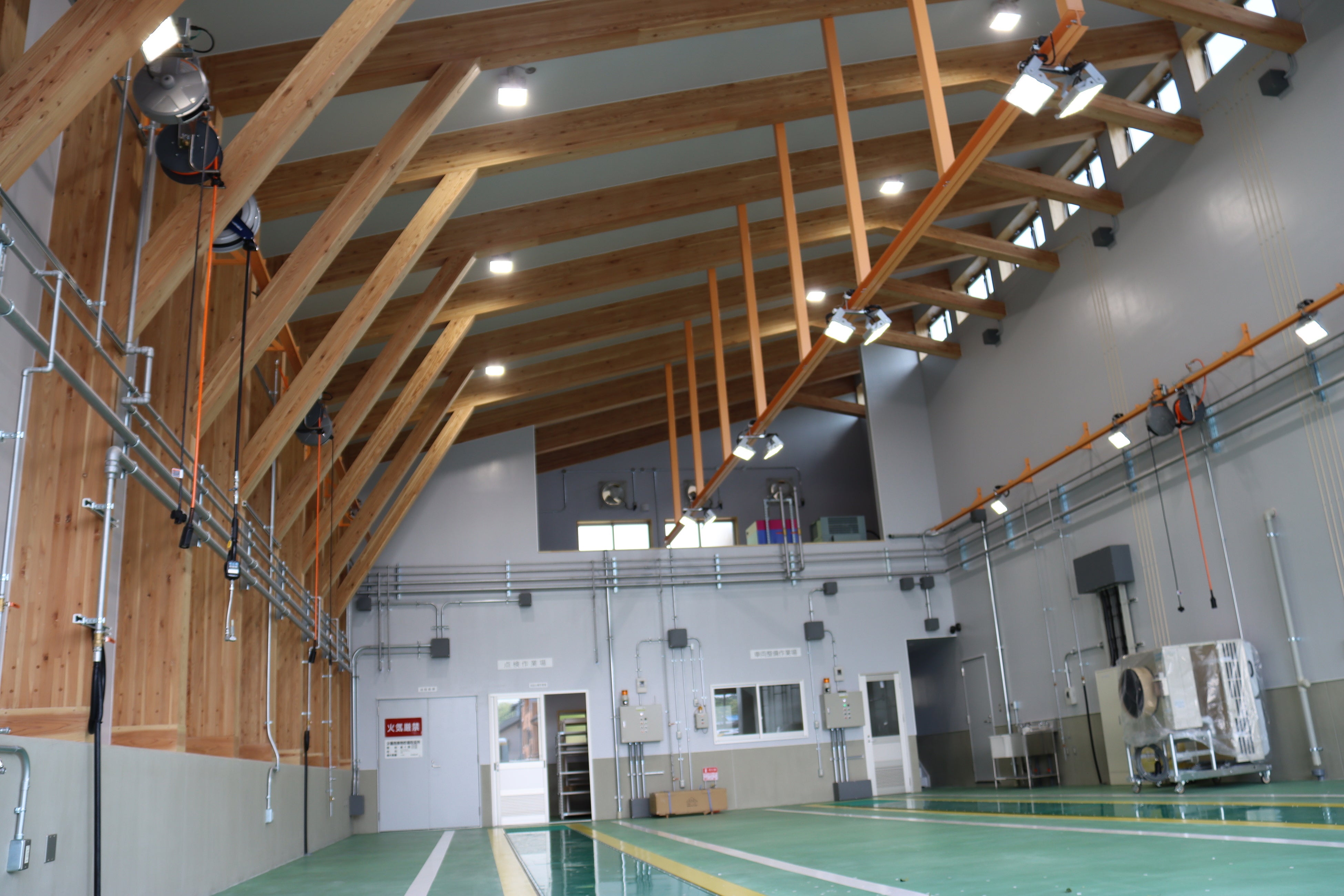 ・また整備場では整備員の目線に近い高さに照明を設置することで作業性を高めつつ、照明の灯数を抑えて消費電力を最小限とする省エネ設計を実現しています。
