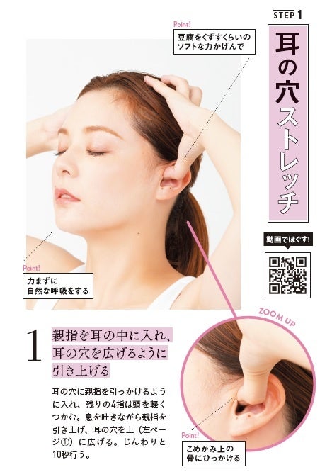 「目元ほぐしは」、「耳の穴ストレッチ」「腕ねじれリセット」「首のこりリセット」の3ステップで、目の奥の奥から疲れをほぐす村木式のメソッド。中でもユニークなのが「耳の穴ストレッチ」です。