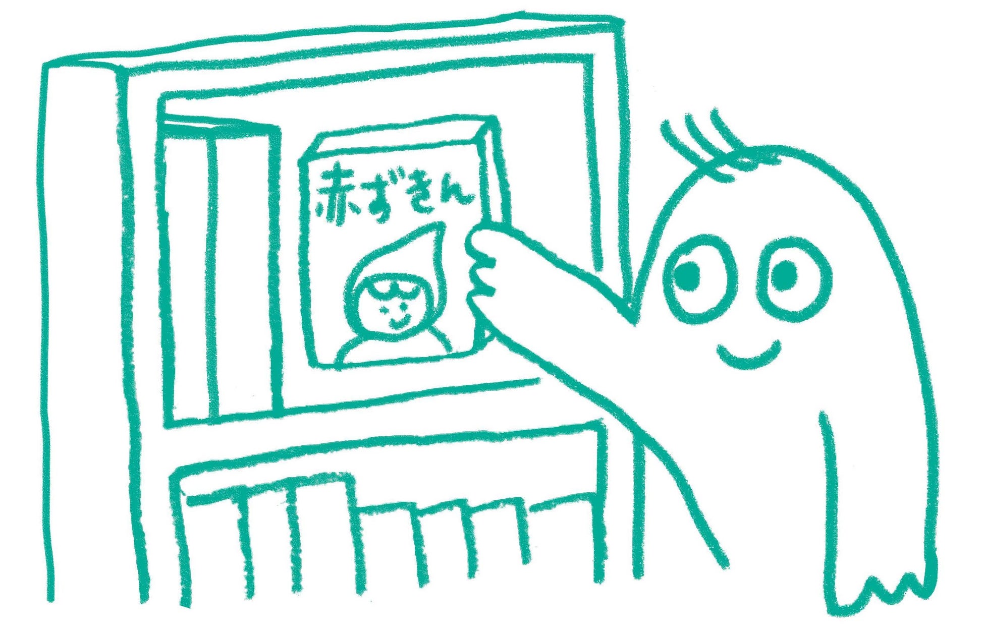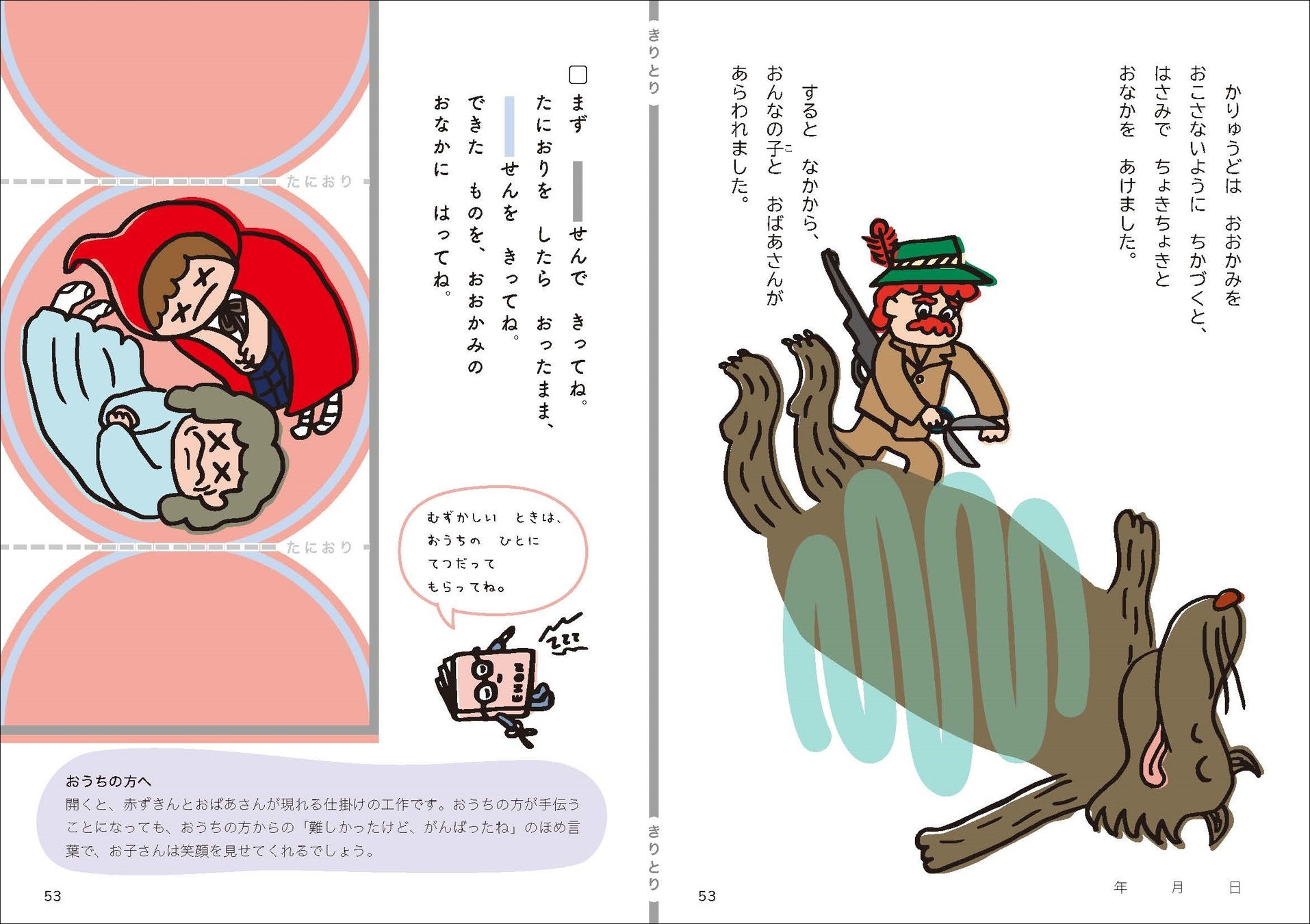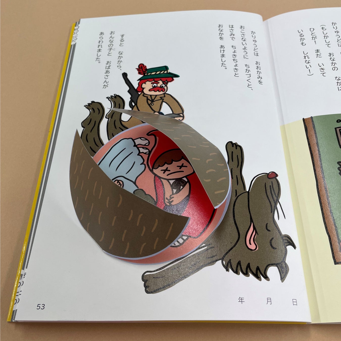▼グリム童話「赤ずきん」の1ページです。折って切って貼るだけで、仕掛け工作が完成します!