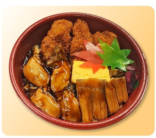 瀬戸内海で育った牡蠣の出汁で炊いた“かきめし”の上に、プリプリの煮牡蠣とカキフライをのせたまさしく牡蠣づくしの丼!ホクホク柔らかな煮穴子と広島菜のお漬物も添えて。
