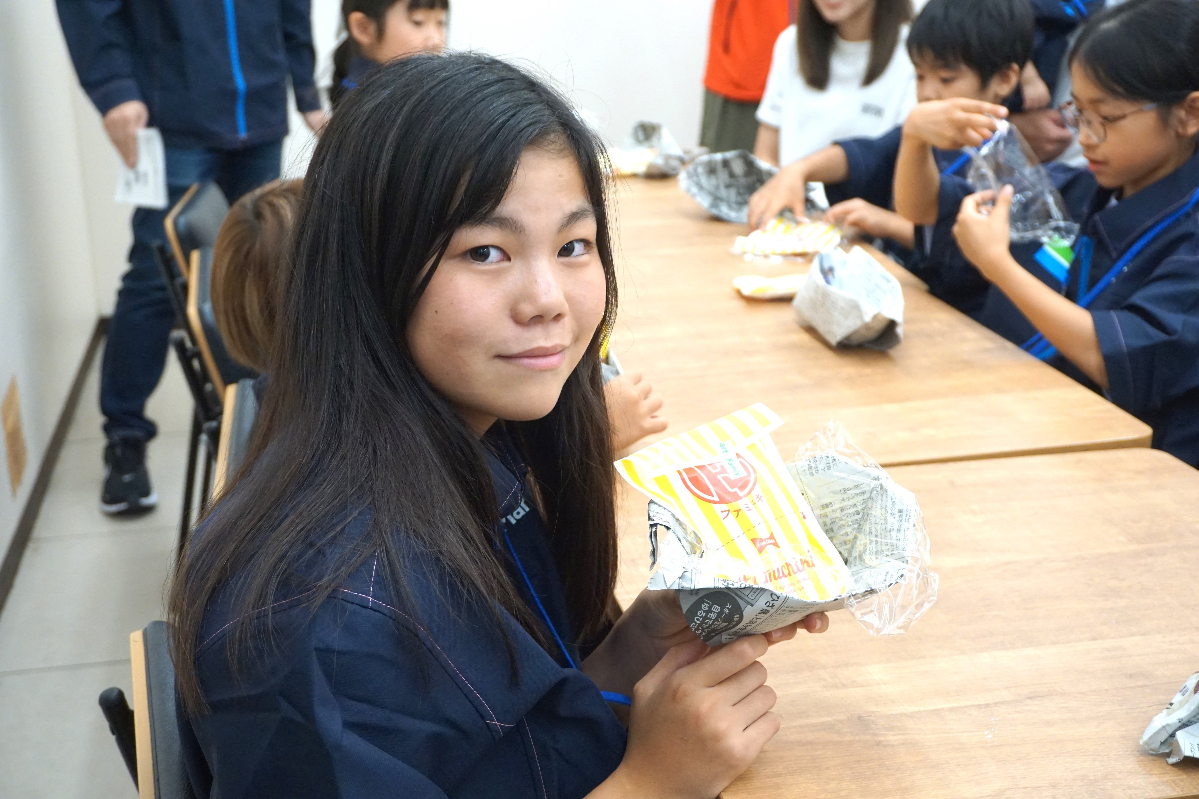 身近なもので工夫する体験として、昨年好評だった新聞紙のコップ作りを発展させ、今年は新聞紙で「お椀」作りに挑戦。完成したお椀に盛り付けたのは「ファミチキ」です。災害時でも、工夫次第で温かく美味しい食事ができることを、楽しみながら体験することができました。
