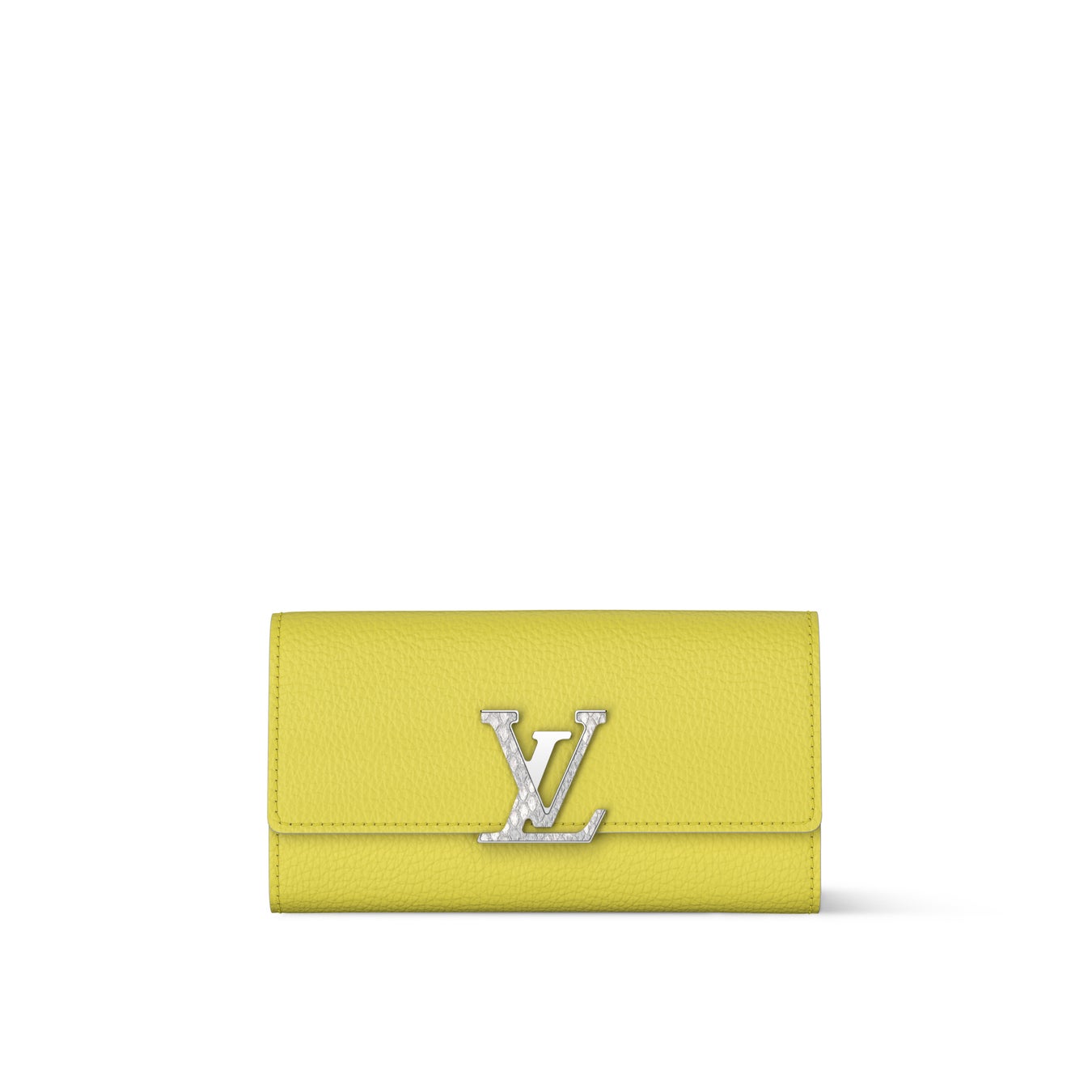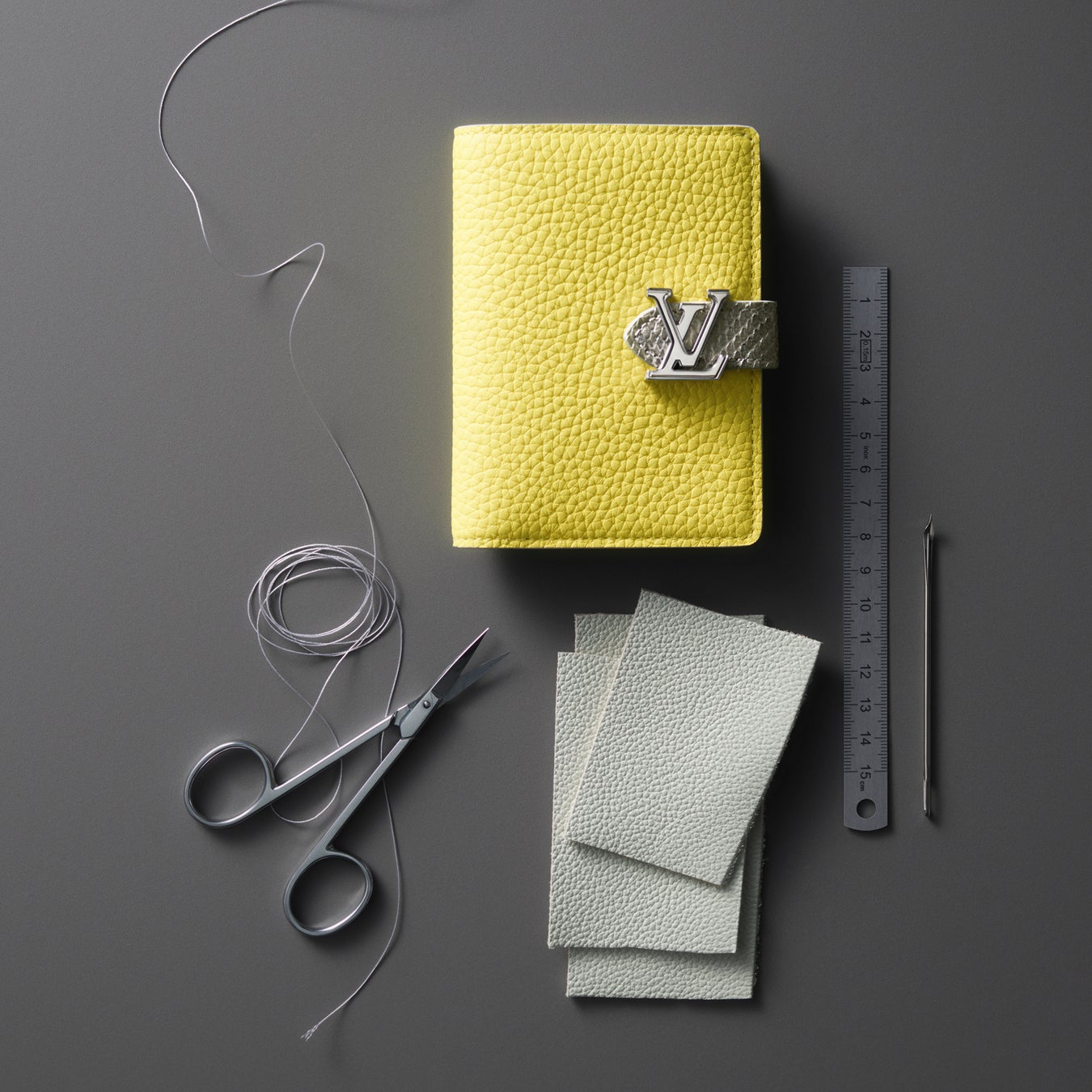 鮮やかなトニックレモン色の「ポルトフォイユ·カプシーヌ」。トリヨンレザーで仕上げたアイテムに、パイソンレザーのトリミングをあしらい、メゾンを象徴するLV イニシャルを配しています。また、内装にはコントラストを描くカーフレザーのライニングを施しました。コインや紙幣を収納できる複数のコンパートメントとポケットに加え、12のカードスロットを備えた機能的なデザイン。