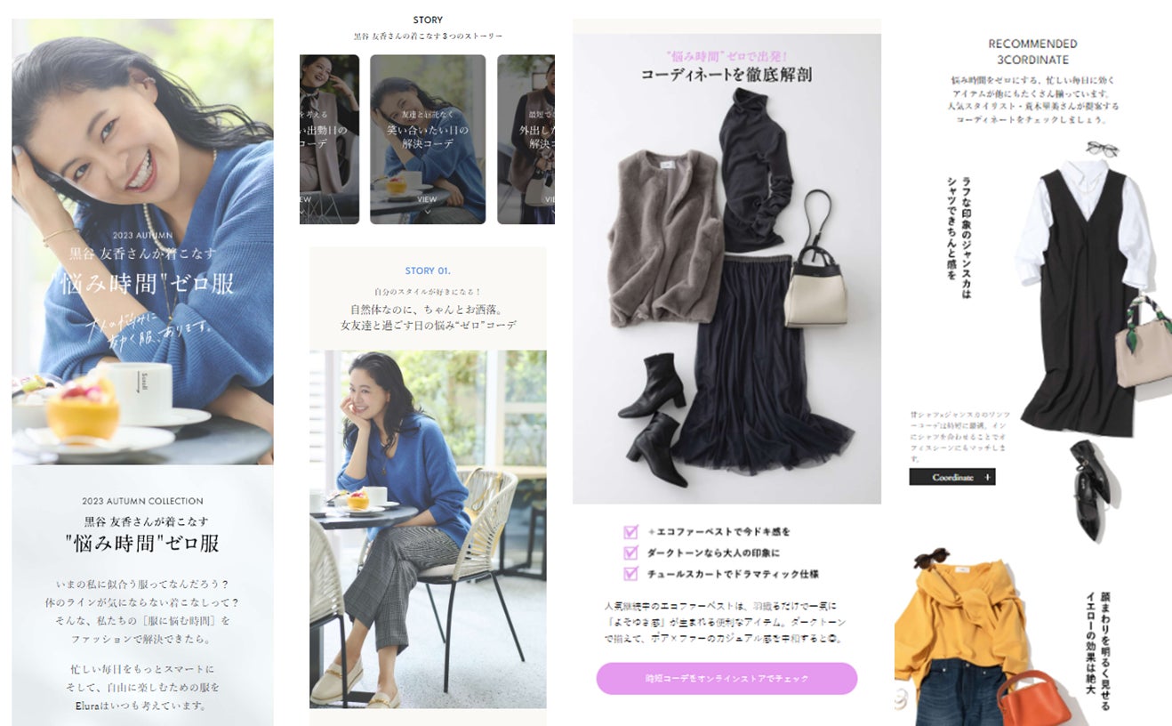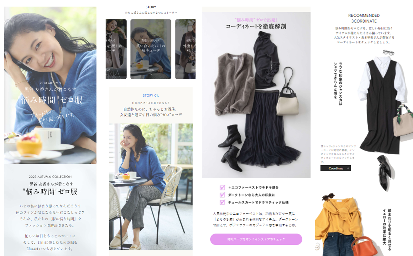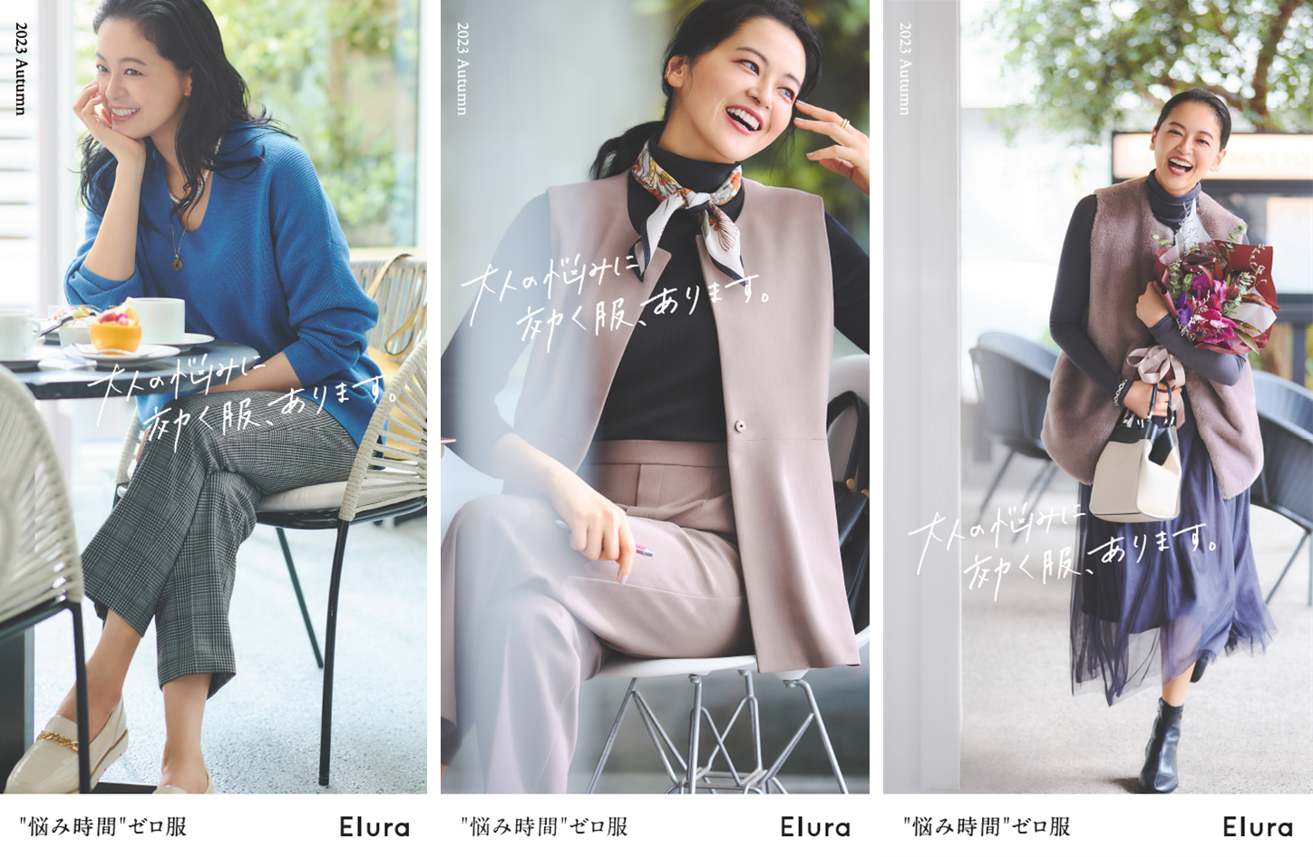 ビジュアルは8月18日(金)に全国のエルーラ店舗で登場します。同時にWEBコンテンツ「2023 AUTUMN 黒谷友香さんが着こなす “悩み時間”ゼロ服」をElura公式WEBサイトで公開。スタイリスト・荒木さんが提案する黒谷さん着用の3つのスタイリングのほか、すぐに取り入れられる様々な「”悩み時間”ゼロ」スタイリングと着こなしのポイントを解説いただきました。サイト内では黒谷さん出演の特別ムービーも公開。ファッションが楽しい秋、大人女性がすぐにマネしたくなる情報が詰まったスペシャルなサイトとなっています。