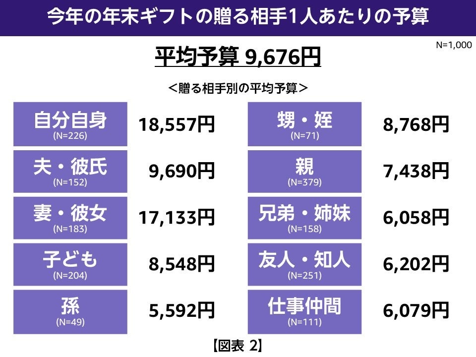 さらに、今年の年末のギフトの具体的な予算を聞いたところ、贈る相手1人あたりの平均は9,676円となりました。贈る相手別で見ると、「自分自身」と「妻・彼女」へのギフトの予算(自分自身:18,557円、妻・彼女:17,133円)は全体平均の約2倍という結果でした【図表2】。