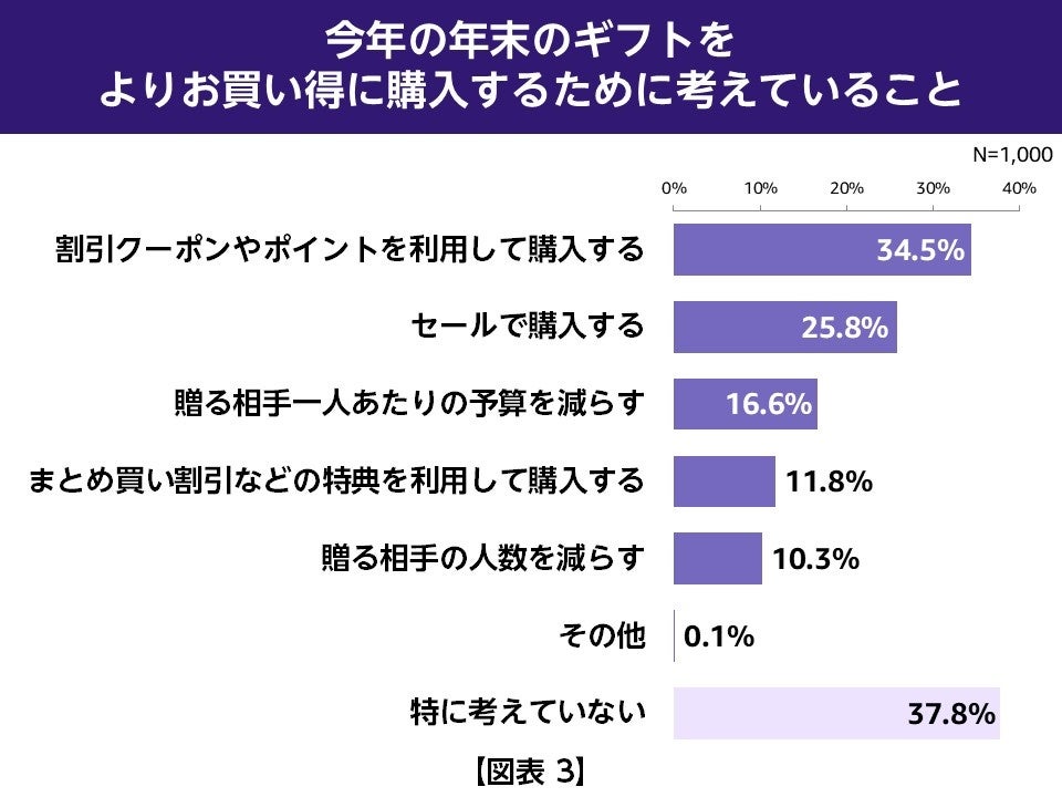 そのようななかでも、一定の節約志向がみられます。今年の年末のギフトをよりお得に購入するために何らかの工夫を考えている方は6割以上で、もっとも多かったのが「割引クーポンやポイントを利用して購入する」(34.5%)、次いで「セールで購入する」(25.8%)という結果になりました【図表3】。