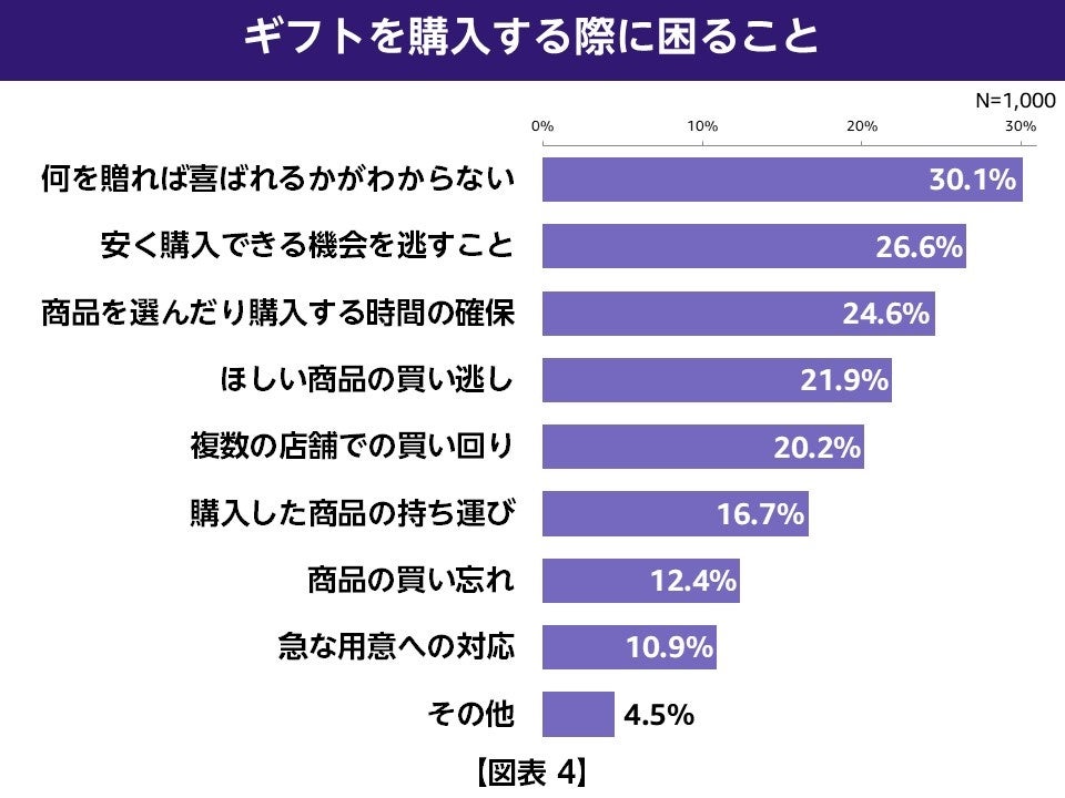 実際に24.6%の人が、「商品を選んだり購入する時間の確保」をお困り事として回答しました。そのほかには、「安く購入できる機会を逃すこと」や「ほしい商品の買い逃し」「複数の店舗での買い回り」などが多く、忙しいなかで、「お買い得」且つ時間と手間の節約につながる「品揃え」と「利便性」が、今年の年末のギフトのポイントになることがわかりました【図表4】。