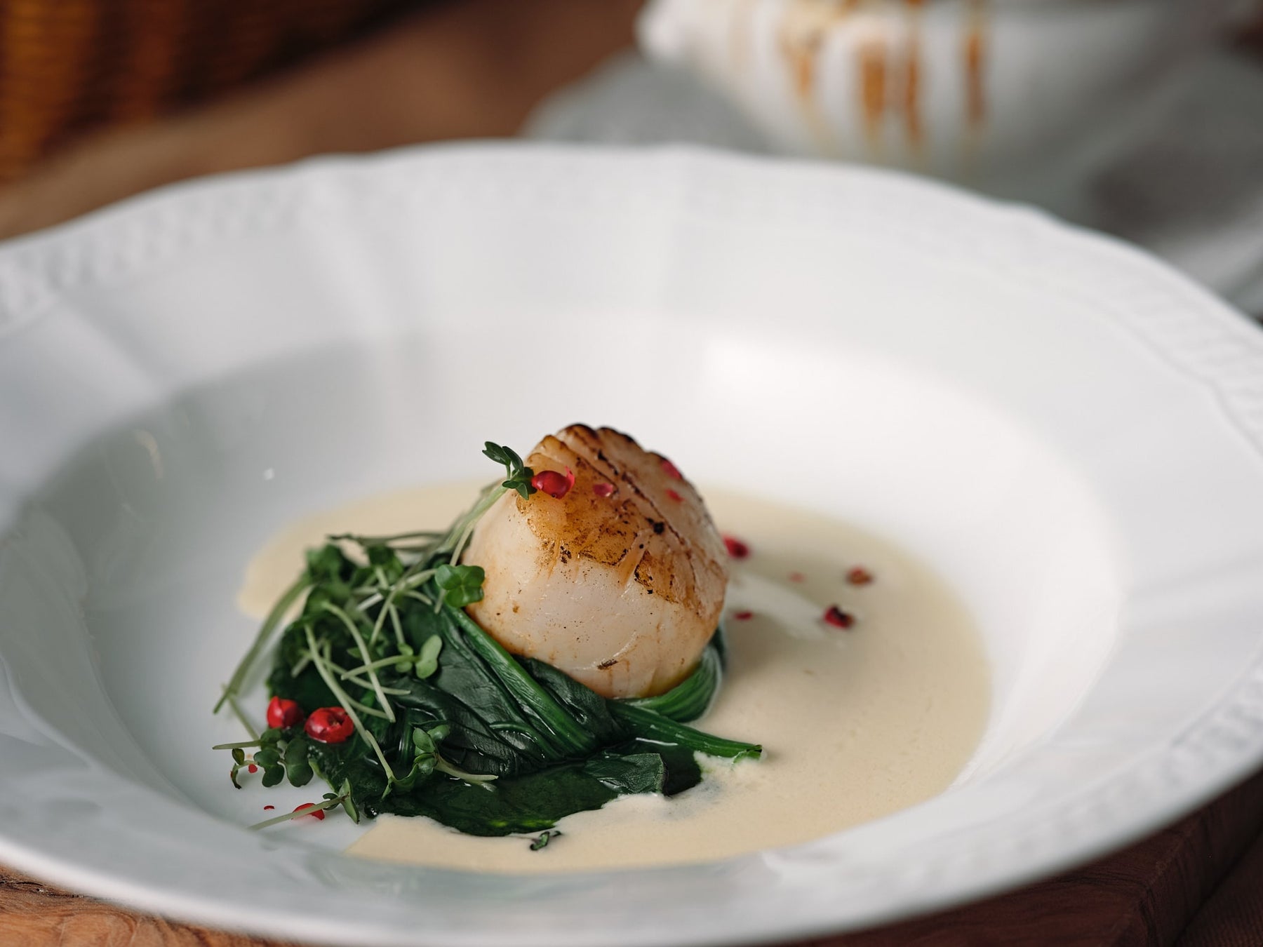 ・温菜:ホタテのポワレ ほうれん草のクーリと白ワインのソース