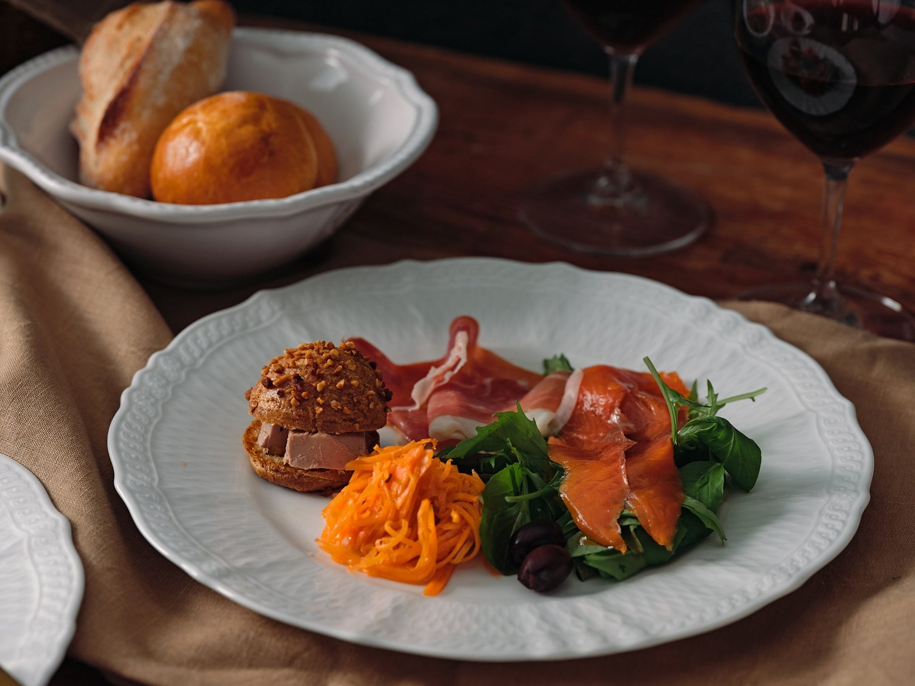 ・前菜:フォアグラムースのプチシューサンド/農園野菜とパテドカンパーニュ