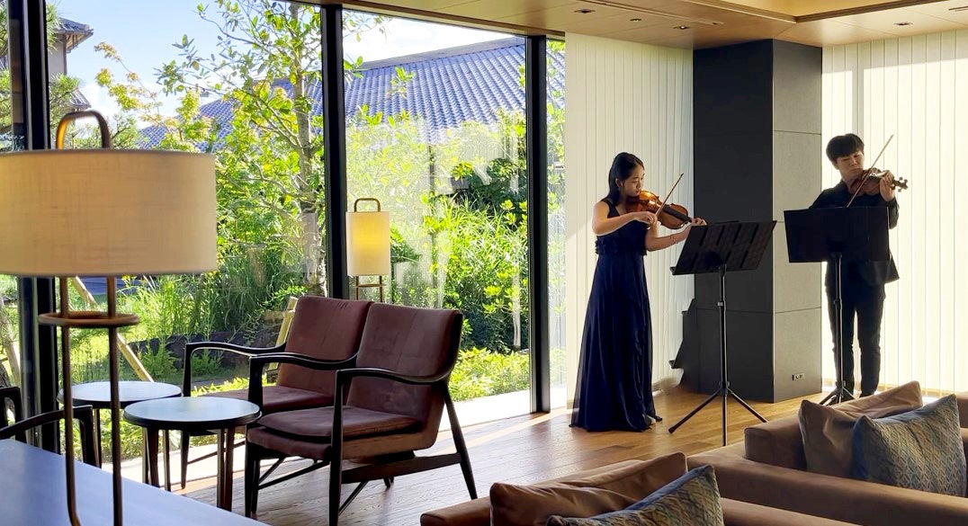 夕刻のゲストラウンジ、朝食レストラン、京都の西山を望むテラスでの朝、管弦楽の心地よい響きをお届けいたします。ステージの上でない目の前での演奏に、演奏者の表情やリズムの取り方など間近にご覧いただけます。音楽を耳だけではなく、視覚的にも楽しめる生演奏です。