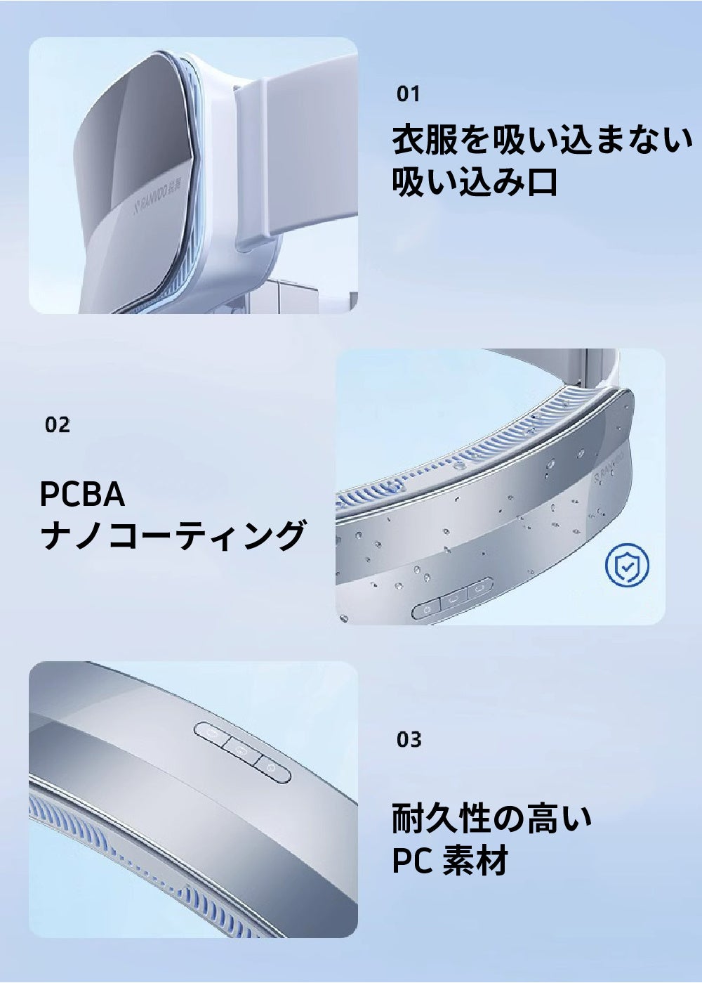コンパクトな見た目からは想像もつかないほど、5m/sのパワフルな風で体全体に風を送ります。