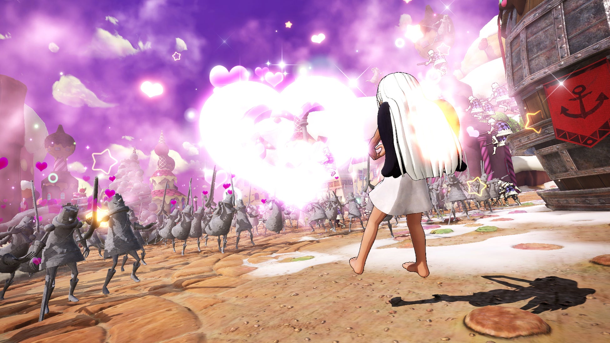本作は、「リアルなONE PIECEの戦場体験」をコンセプトに、アクション中に破壊される建物や土煙が漂う空気感など「ONE PIECEの戦場体験」を追及!従来の「海賊無双」では出来なかった「破壊アクション」「空中無双アクション」「フォルムチェンジ」などの新要素を盛り込むことで、これまで以上に爽快な『ONE PIECE』無双アクションを実現しています。