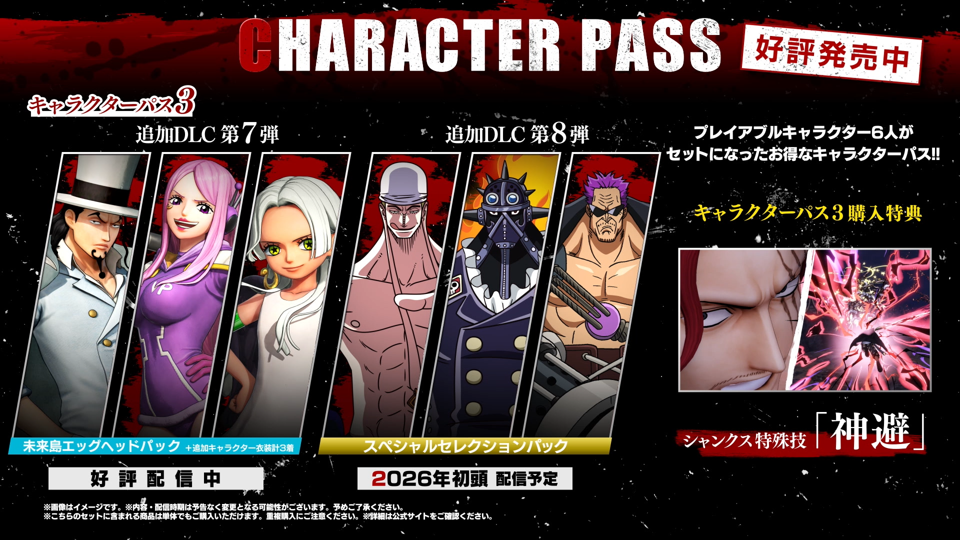 本日配信した追加DLCキャラクターパック第7弾「未来島エッグヘッドパック」と2026年初頭に配信予定のキャラクターパック第8弾「スペシャルセレクションパック」がセットになったお得な「キャラクターパス3」も好評発売中!