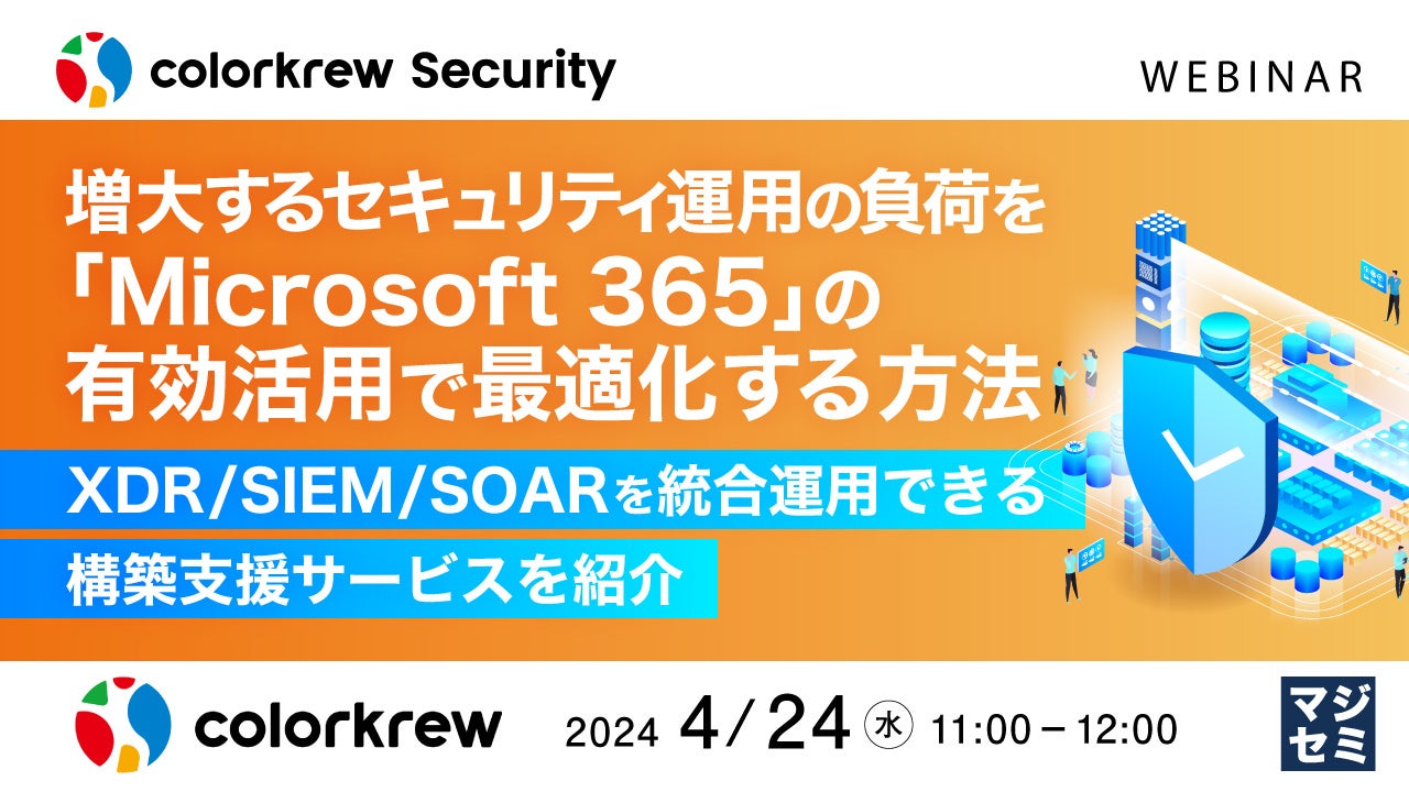 さらに、2023年に日本マイクロソフトの「Secure multicloud environment Award」を受賞したColorkrewが提供する「Microsoft 365セキュリティ支援」サービスを紹介。独自の脅威検知機能や柔軟なアラートのカスタマイズなどに加え、Microsoft 365ライセンスで使用可能なセキュリティ・サービスの導入支援、その後の監視運用まで総合的に支援するソリューションについて、その概要や導入効果などをご説明します。「セキュリティベンダーや製品を統合したい」「セキュリティ運用のコストを抑えたい」という方は、ぜひご参加ください。