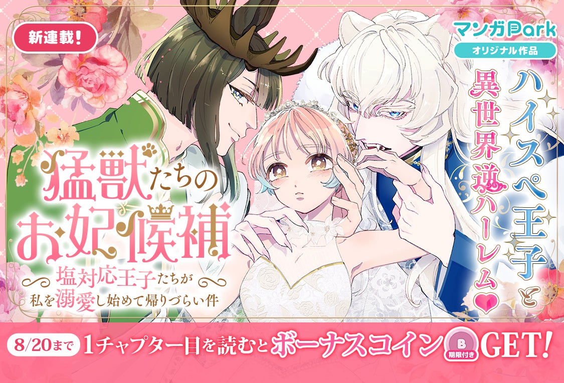 コイン配布の新連載記念キャンペーンも実施!ハイスペ王子と異世界逆ハーレム♪『猛獣たちのお妃候補~塩対応王子たちが私を溺愛し始めて帰りづらい件~』8/14~「マンガPark」で連載開始!