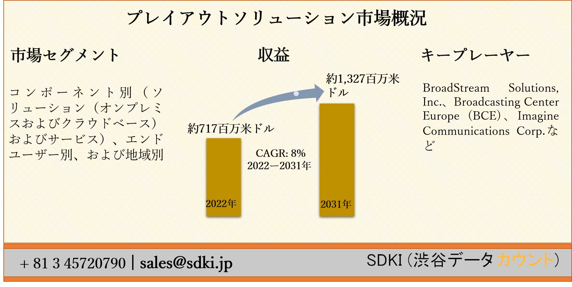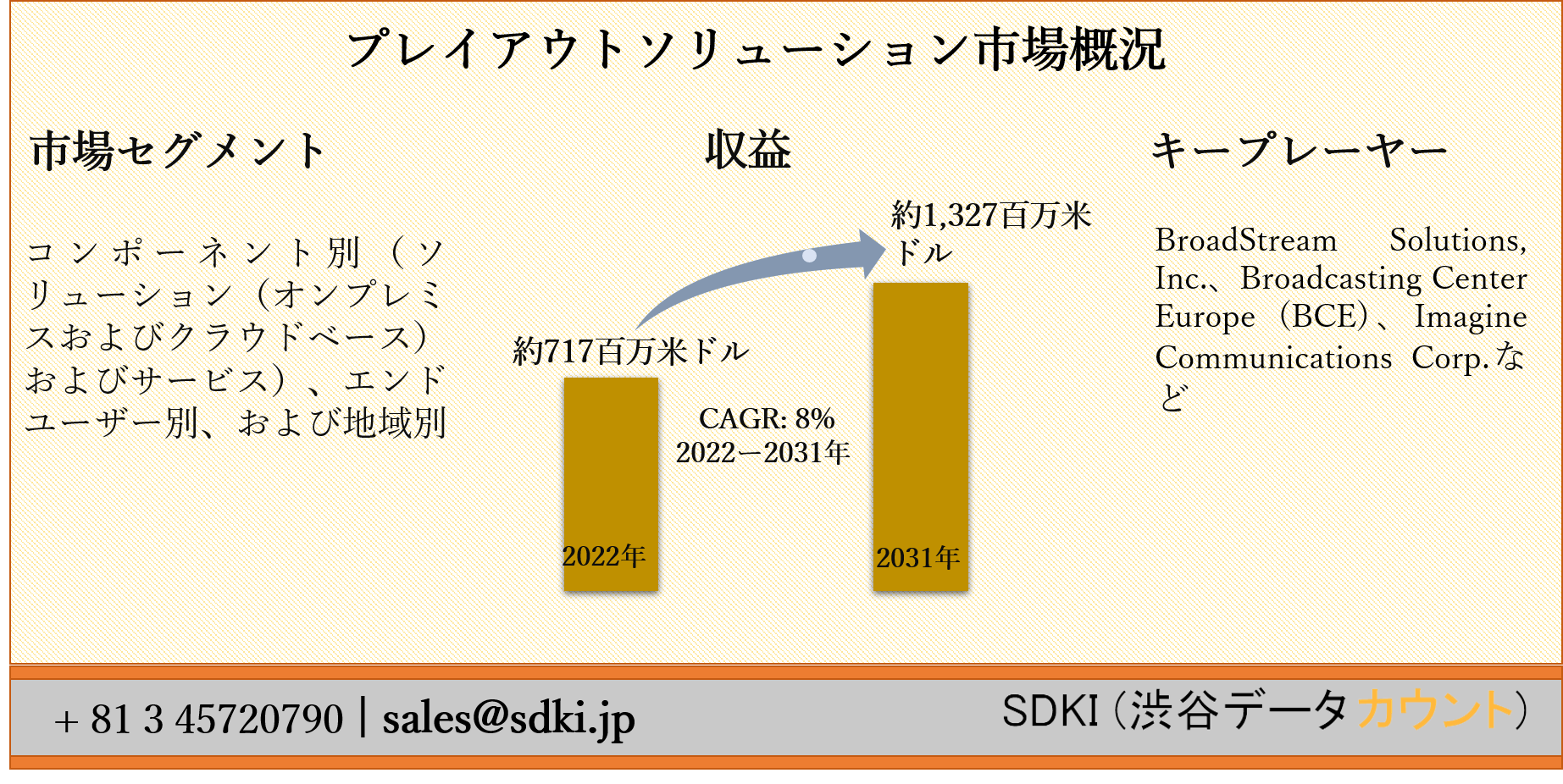 プレイアウトソリューション市場は、2022年に約717百万米ドルの市場価値から、2031年までに約1,327百万米ドルに達すると推定され、2022-2031年の予測期間中に8%のCAGRで成長すると予想されています。