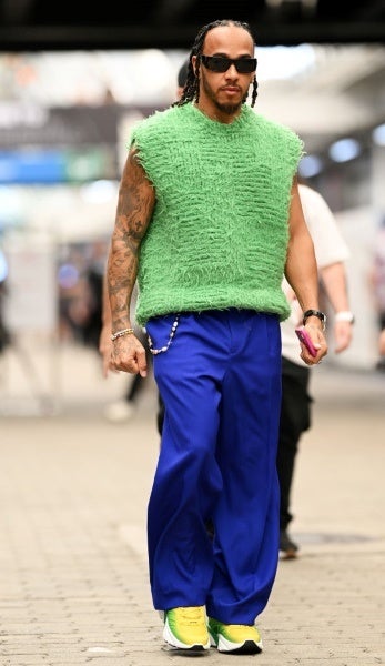 ルイス・ハミルトンは、メンズ コレクションからカスタムメイドのグリーンのノースリーブクルーネックニットに、ブルーのコットンラージパンツを合わせ、カスタムメイドのイエローとグリーンの「B44 ブレード」スニーカーを着用しました。