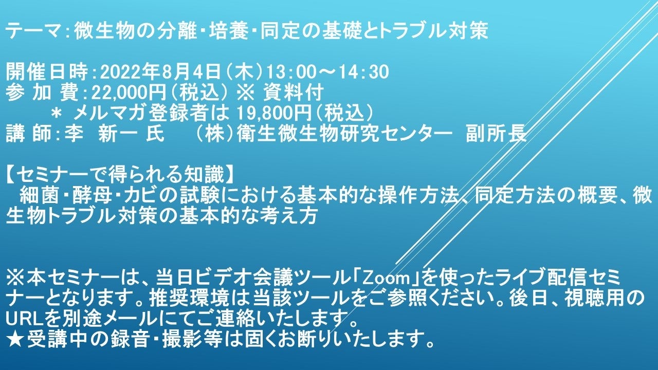 先端技術情報や市場情報を提供している(株)シーエムシー・リサーチ(千代田区神田錦町: https://cmcre.com/ )では、 各種材料・化学品などの市場動向・技術動向のセミナーや書籍発行を行っておりますが、 このたび「微生物の分離・培養・同定の基礎とトラブル対策」と題するセミナーを、 講師に李 新一 氏 (株)衛生微生物研究センター 副所長)をお迎えし、2022年8月4日(木)13:00より、 ZOOMを利用したライブ配信で開催いたします。 受講料は、 一般:22,000円(税込)、 弊社メルマガ会員:19,800円(税込)となっております(資料付)。