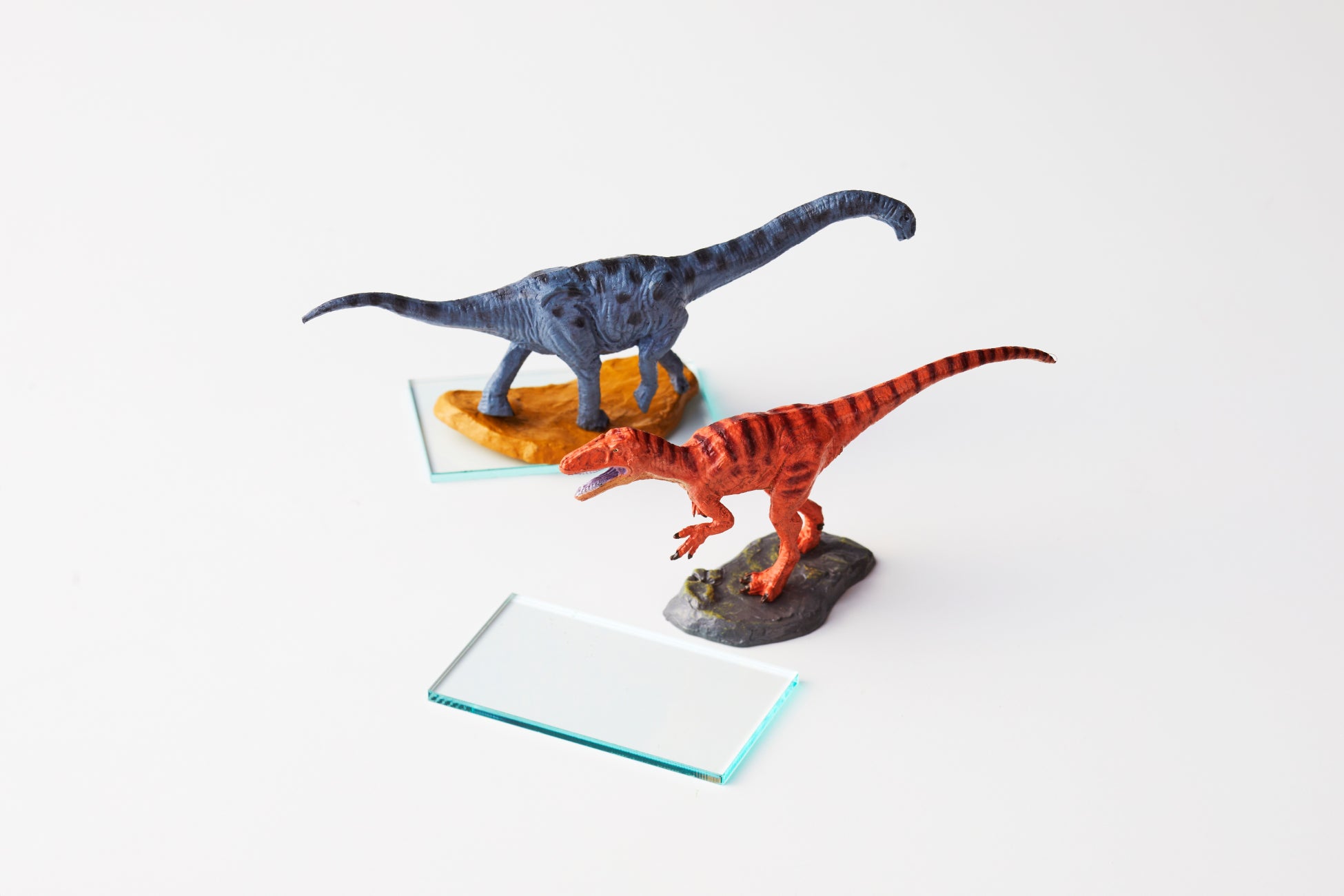福井県立恐竜博物館が監修した付属の恐竜フィギュア・フクイラプトル(写真下)、フクイティタン(写真上)を飾ってお楽しみください。