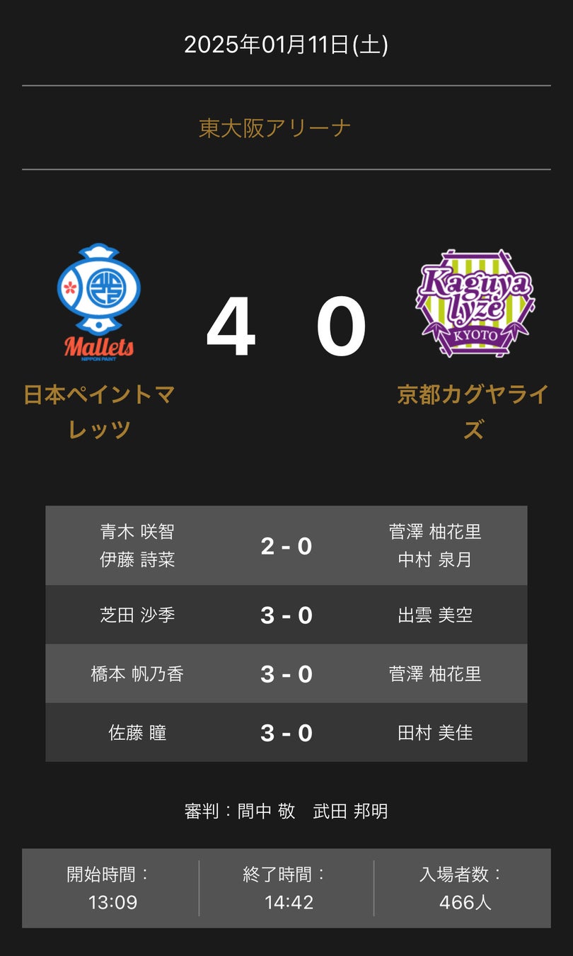 ノジマTリーグ 2024-2025シーズン 公式戦 1月11日開催 日本ペイントマレッツ vs 京都カグヤライズの試合は4-0で日本ペイントマレッツが勝利しました。