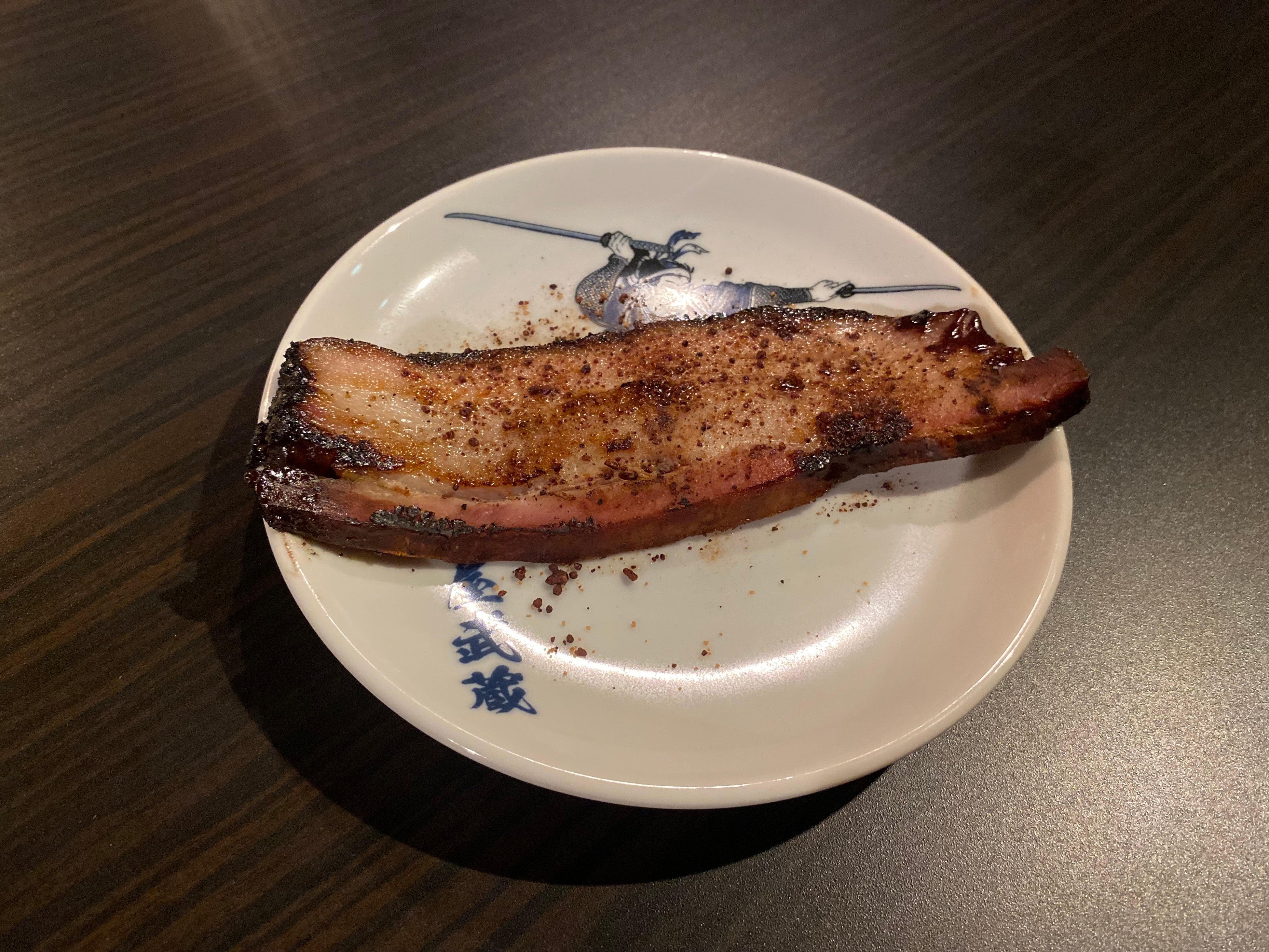 - こだわりのチャーシューベーコンは、豚バラ肉を特製のタレに一晩漬けこみ燻製に。さらにチャーシューのタレとプレミアムガーナダークミルクでコーティングし、カカオニブ・シナモン・塩をふりかけ、チョコレートの香りのするベーコンに仕上げました。
