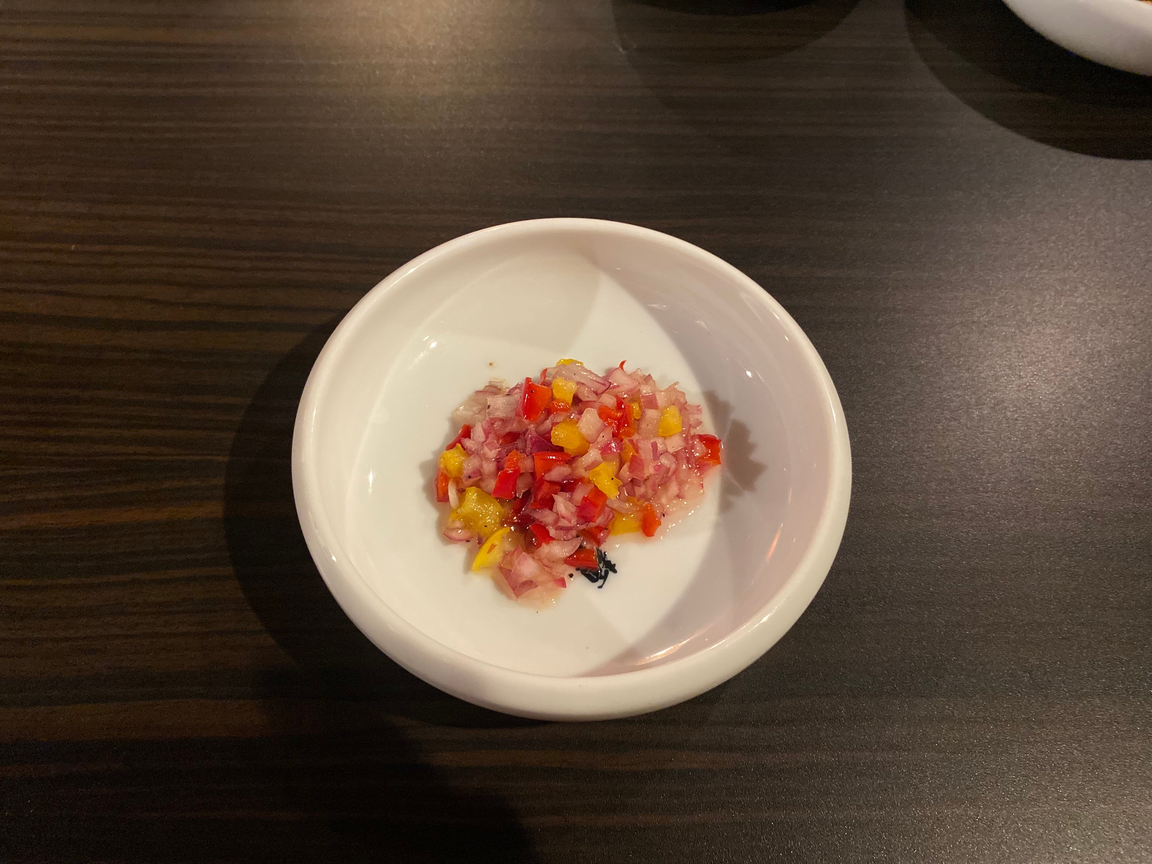 パプリカ、アーリーレッドをさいころ状にカットしてマリネに。にんにくとブラックペッパーを入れて背徳感を演出。