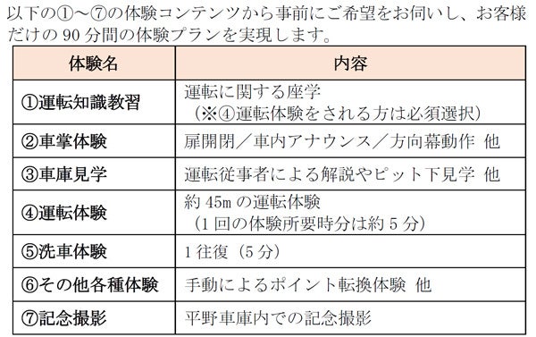 能勢電鉄では、運転体験や車掌体験、平野車庫での特別記念撮影などを盛り込んだ体験型福袋を6組様限定で発売します。事前に当社がご用意した体験型コンテンツの中から、ご購入いただいたお客様のご希望をもとにプランニングした90分間の体験をひとりじめでお楽しみいただきます。