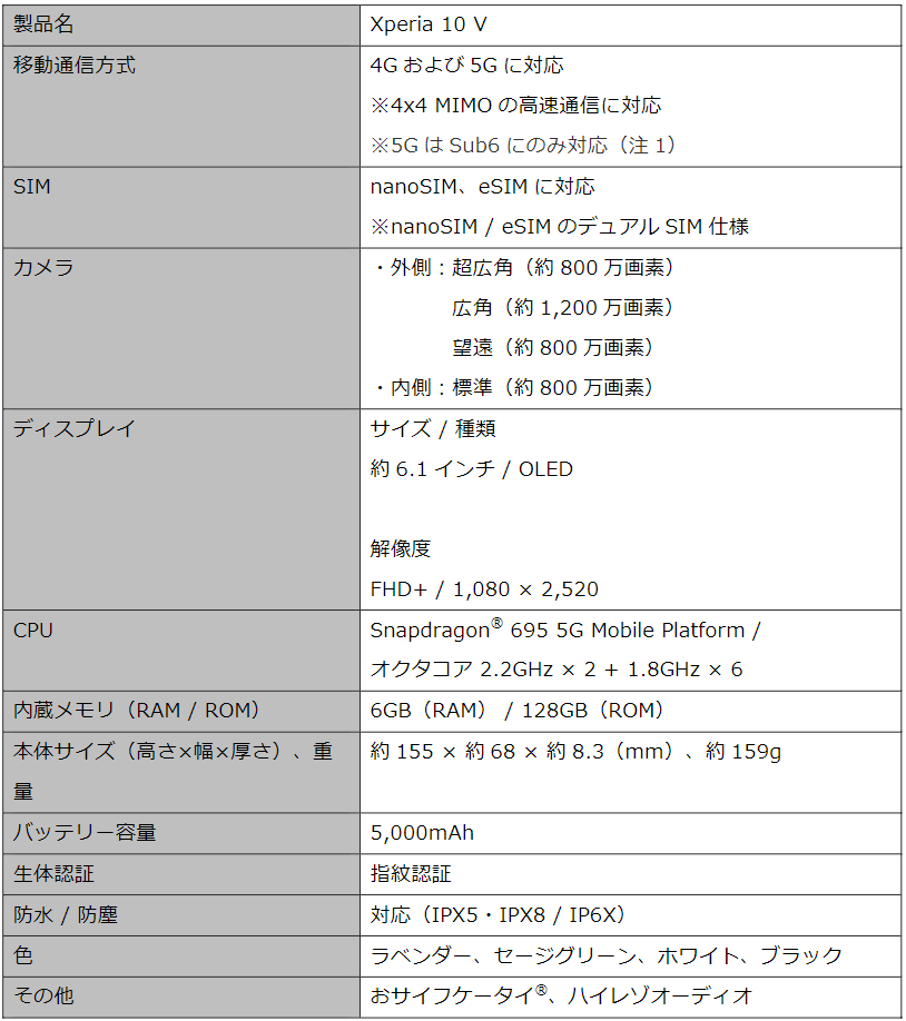 「Xperia 10 V」は、「Xperia 10シリーズ」初のフロントステレオスピーカーを搭載し、ソニーならではの迫力ある高音質なサウンドを実現します。また、従来機種の「Xperia 10 IV」と比較して、輝度を約1.5倍向上させた有機ELディスプレイを搭載しております。鮮やかなディスプレイによって、臨場感のあるドラマや映画、音楽ライブ等の視聴ができます。カメラには超広角、広角、望遠の3つのレンズを搭載し、広角レンズはセンサーサイズが大きくなり(注2)、より明るく鮮明な撮影が可能になりました。また、被写体や撮影環境を自動で判断し、最適な設定を自動で選択する機能や、光学式手ブレ補正機能を搭載している(注3)ため、容易に手ブレを抑えた撮影ができます。さらに、5,000mAhの大容量バッテリーを搭載しており、約34時間の連続動画再生が可能です。また、充電時のバッテリーへの負荷を軽減する「いたわり充電」と独自の「充電最適化技術」により3年使用(注4)してもバッテリーが劣化しづらくなっています。