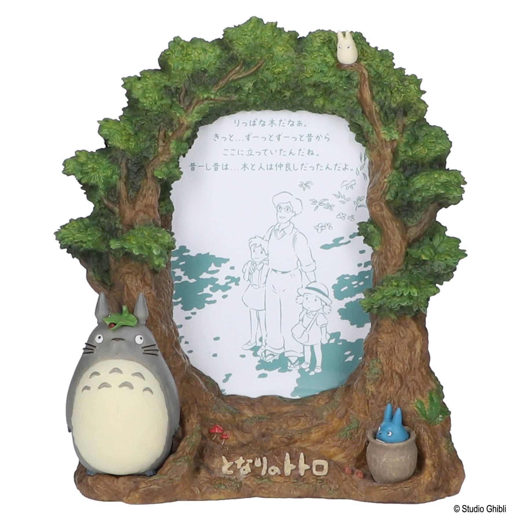 中に入れた写真が木々に囲まれたように見える「となりのトトロ フォトフレーム トトロの森」は、幹の質感や葉っぱの彩色にこだわり、映画の世界観を表現しました。フレームの左には頭に葉っぱを乗せたトトロ、右側には木の根の間のつぼに隠れた中トトロ、木の上には小トトロがいて、それぞれフォトフレームの中心部に視線を送っています。お気に入りの写真を入れると、トトロたちが覗き込んでいるようすを楽しめる、遊び心のあるデザインです。