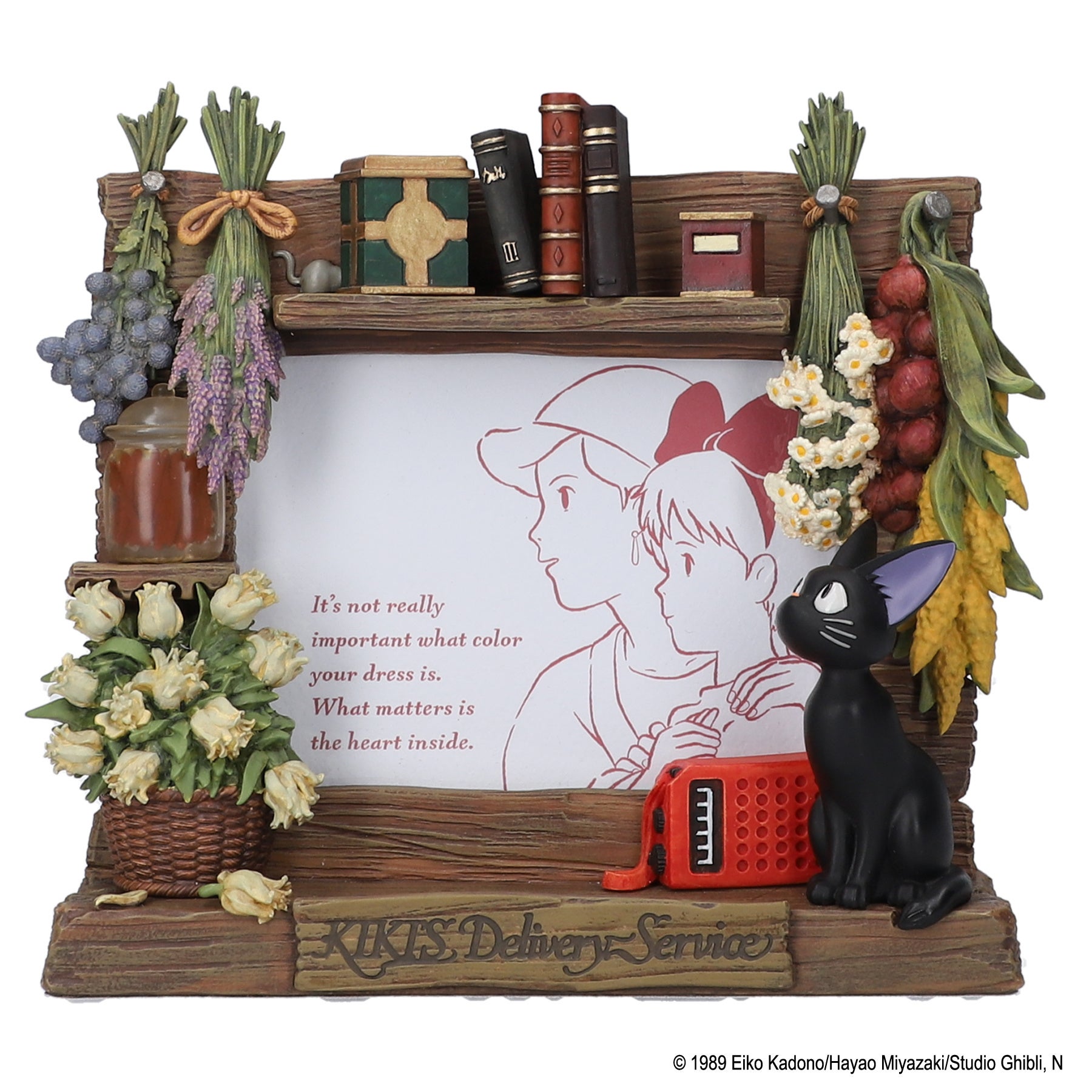 同日より登場する、キキの母・コキリが薬を調合している部屋をイメージにした「魔女の宅急便 フォトフレーム 魔女の家」には、棚からぶら下がるドライフラワーや薬草が詰まった瓶、バラバラに陳列された本など作中に登場するモチーフをあしらいました。さまざまなモチーフに紛れた上部のネズミを見つめるジジの表情からも、こだわりを感じられる一品です。